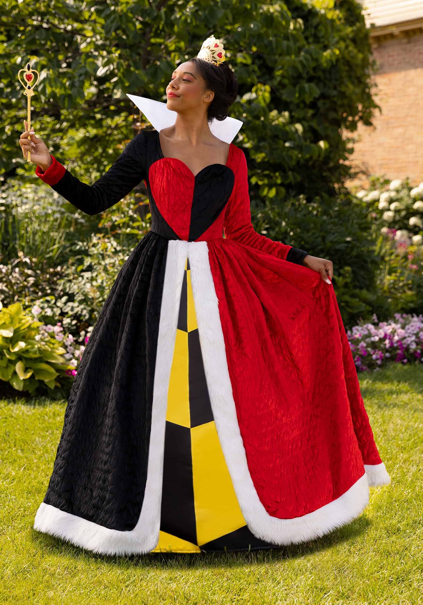 This beautiful outfit is a Made By Us design inspired by the Queen of Hearts from the movie! The long-sleeved gown zips up the back and features a stylized look of black and red quilted hearts. The high collar, faux fur trim, and heart-shaped bodice accent the design and are made brighter with a yellow and black underskirt. Complete the look with the heart-themed tiara!