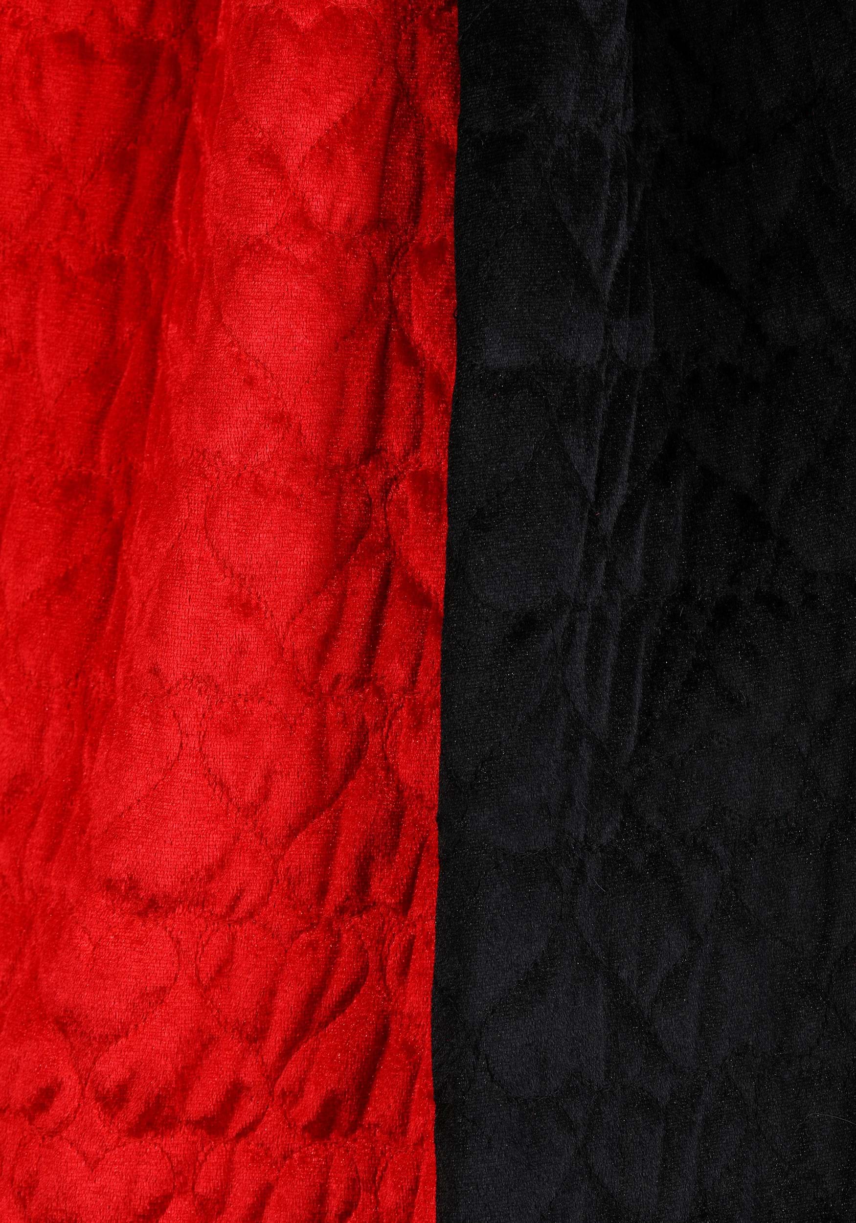 - One piece dress is styled to look like a quilted velvet gown over a dull satin underskirt