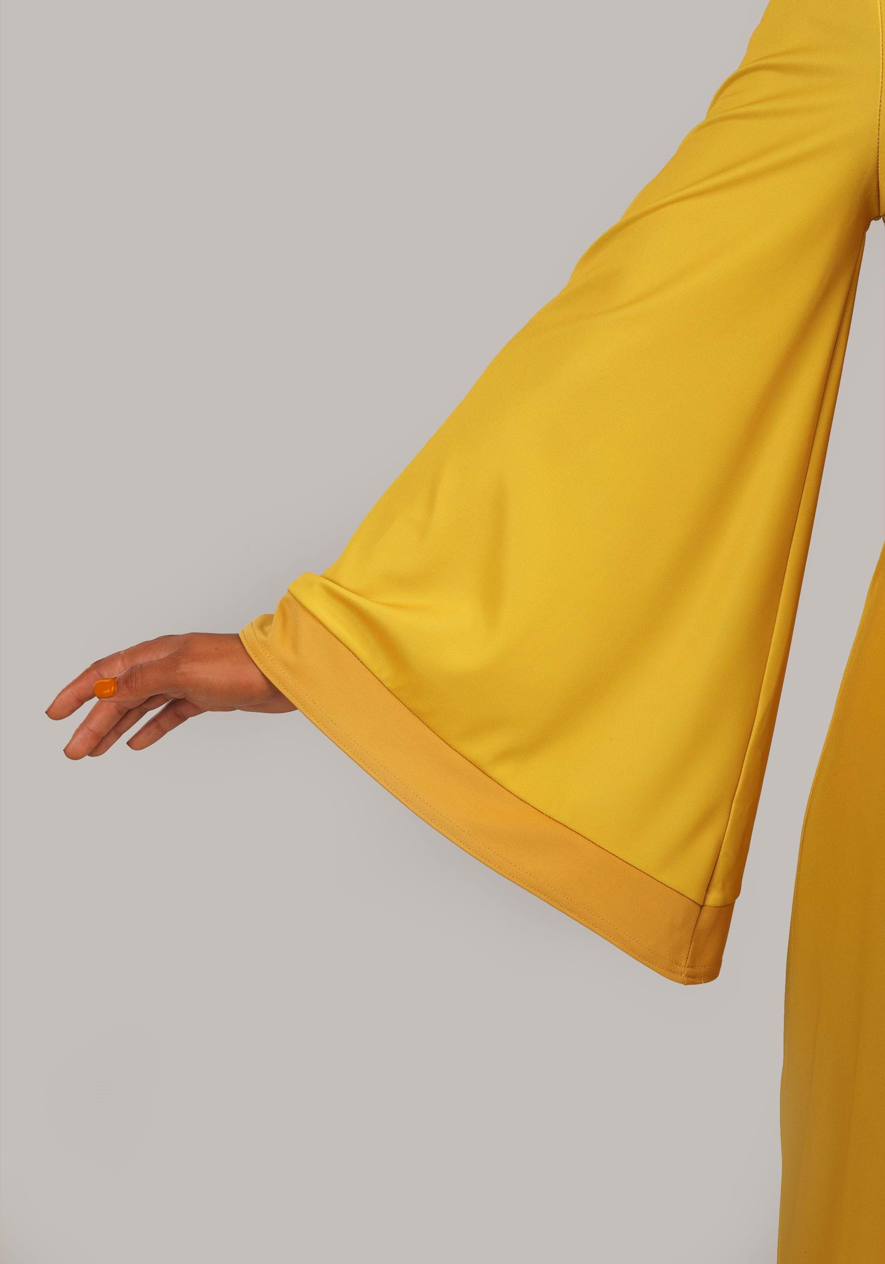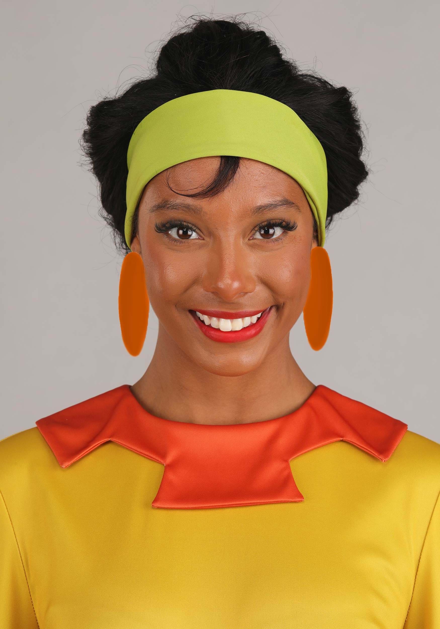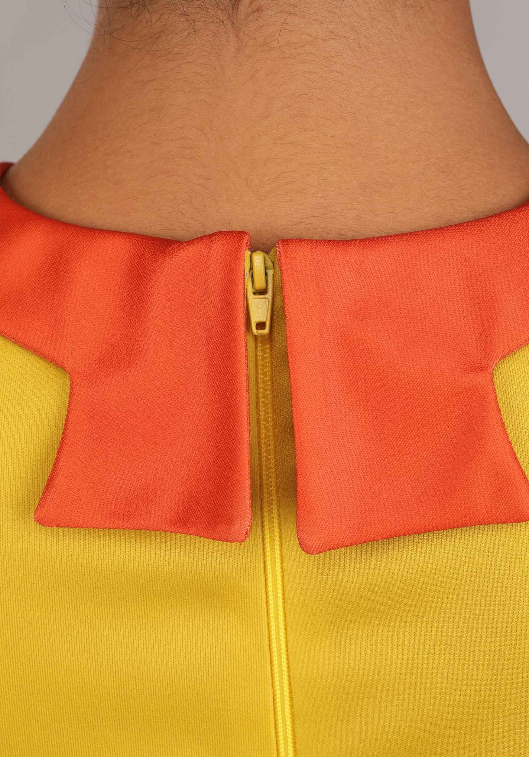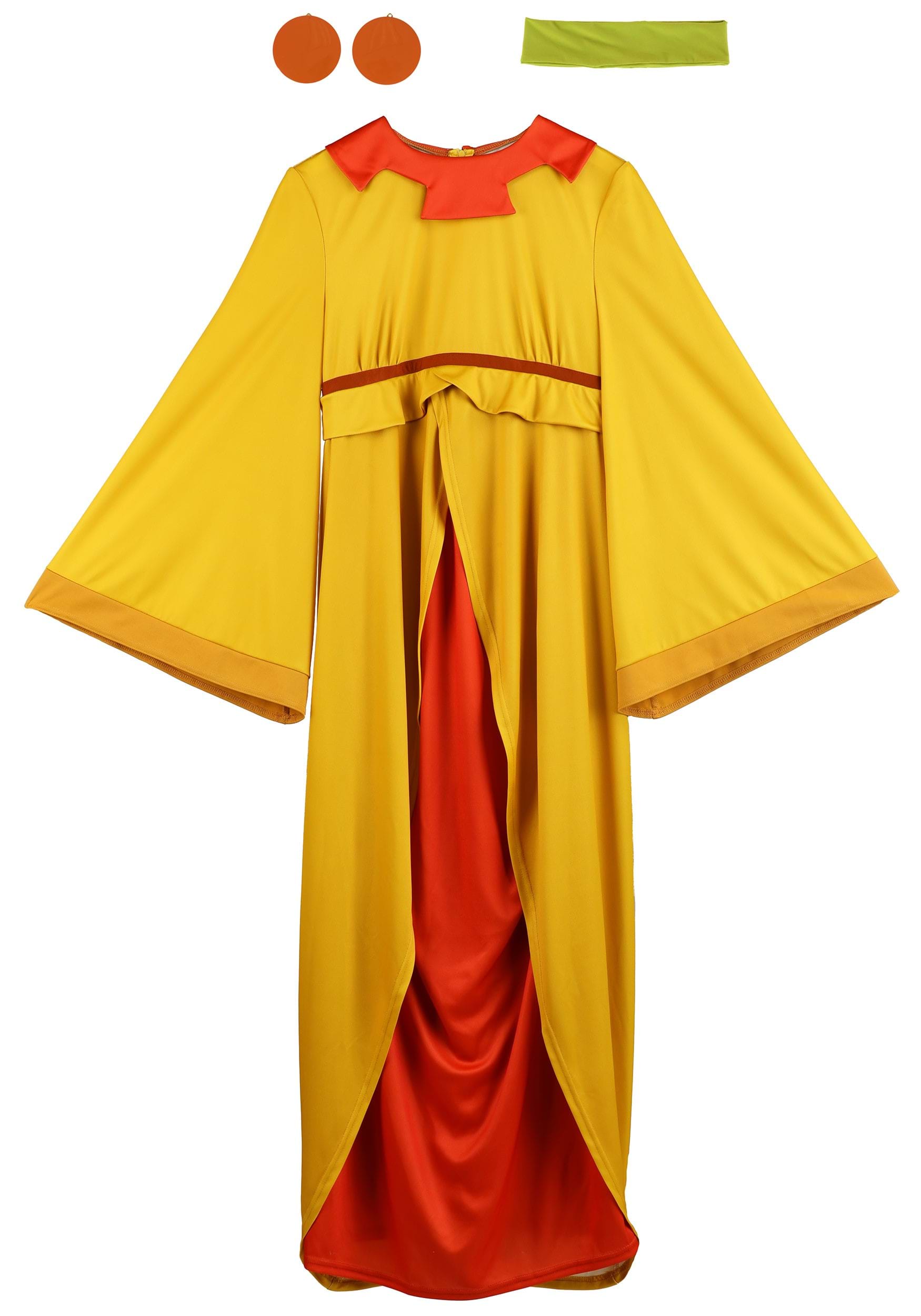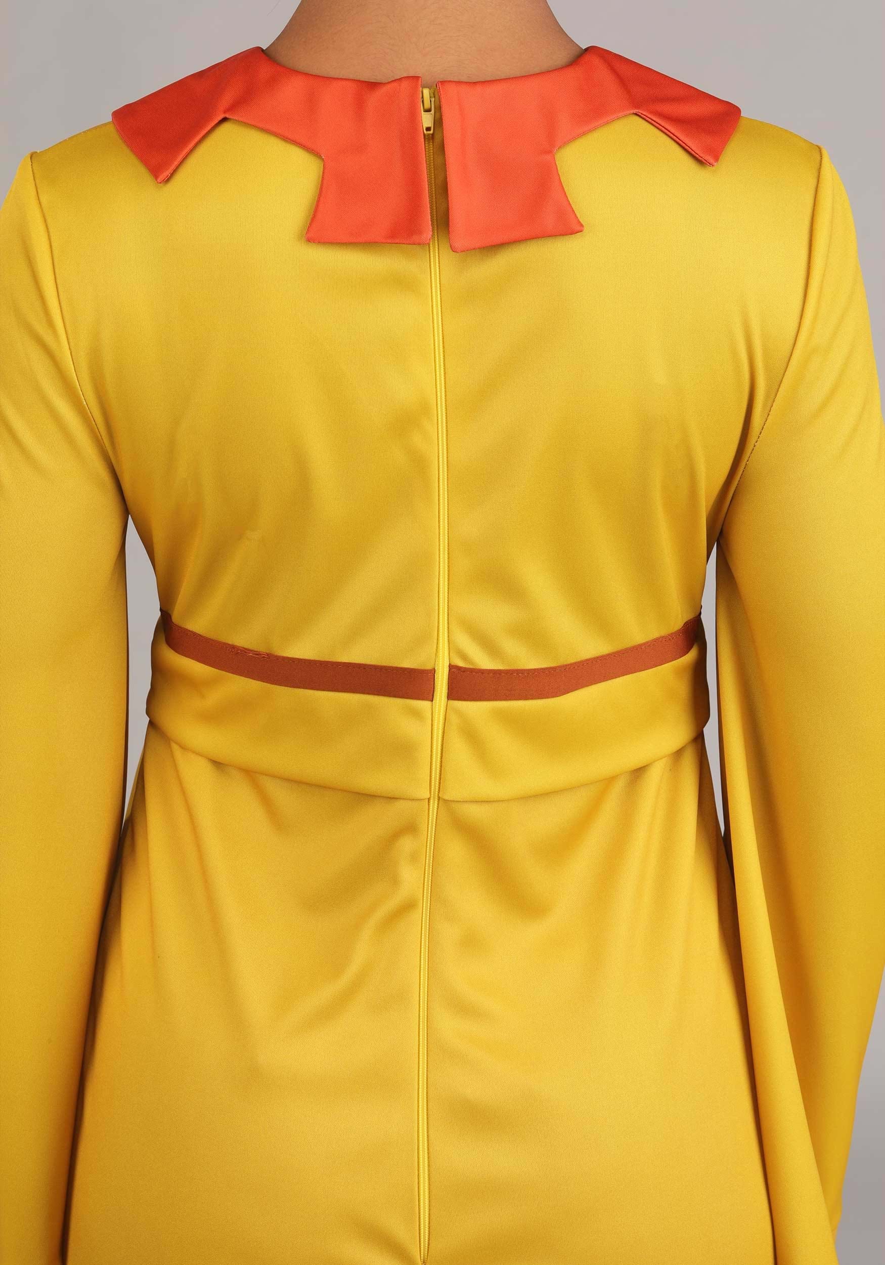 This officially licensed costume starts with mid-weight jersey materials used to shape a full-length dress with billowy sleeves and an empire waist. A zipper down the back ensure easy dressing, a ruched waistline on the inner skirt offers a comfortably snug fit. A decorative collar, contrasting sleeve cuffs, and a stitched in belt ensure the costume matches Chicha's signature style. A wide stretch headband and clip-on medallion earrings complete the look.