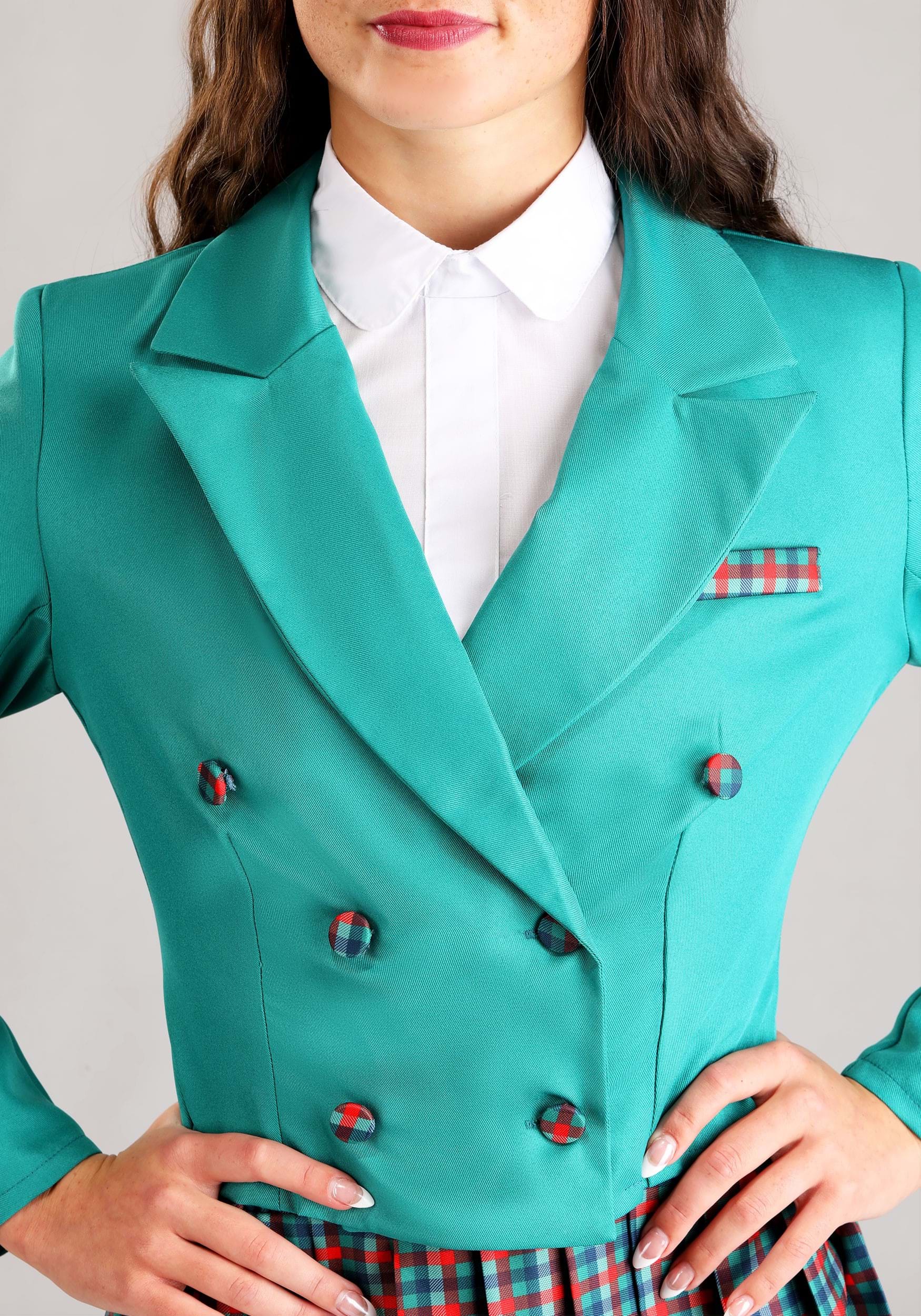 The ensemble includes a sharply structured turquoise jacket that buttons up the front with matching plaid accents, giving the whole look that crisp, queen-bee feel. The attached shirt front layers seamlessly underneath, delivering that prim-and-perfect vibe without the hassle of actually wearing a full blouse.