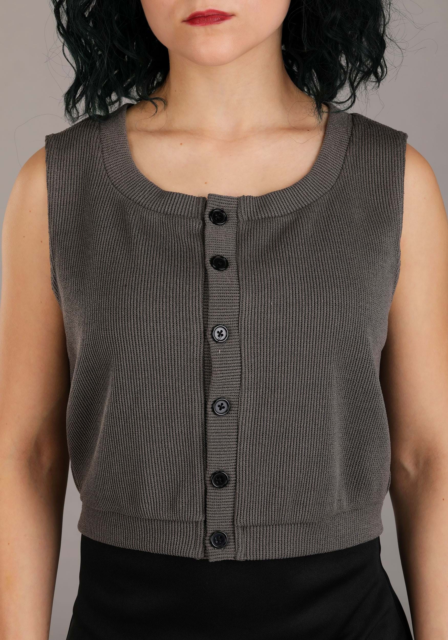 The black slip dress sets the foundation with its sleek, minimalist design, giving you that "I just threw this on, but somehow it works" vibe. Over it, the button-up vest sweater adds a touch of structure, making the outfit feel layered and lived-in—perfect for capturing Marla's signature mix of effortless and eccentric.