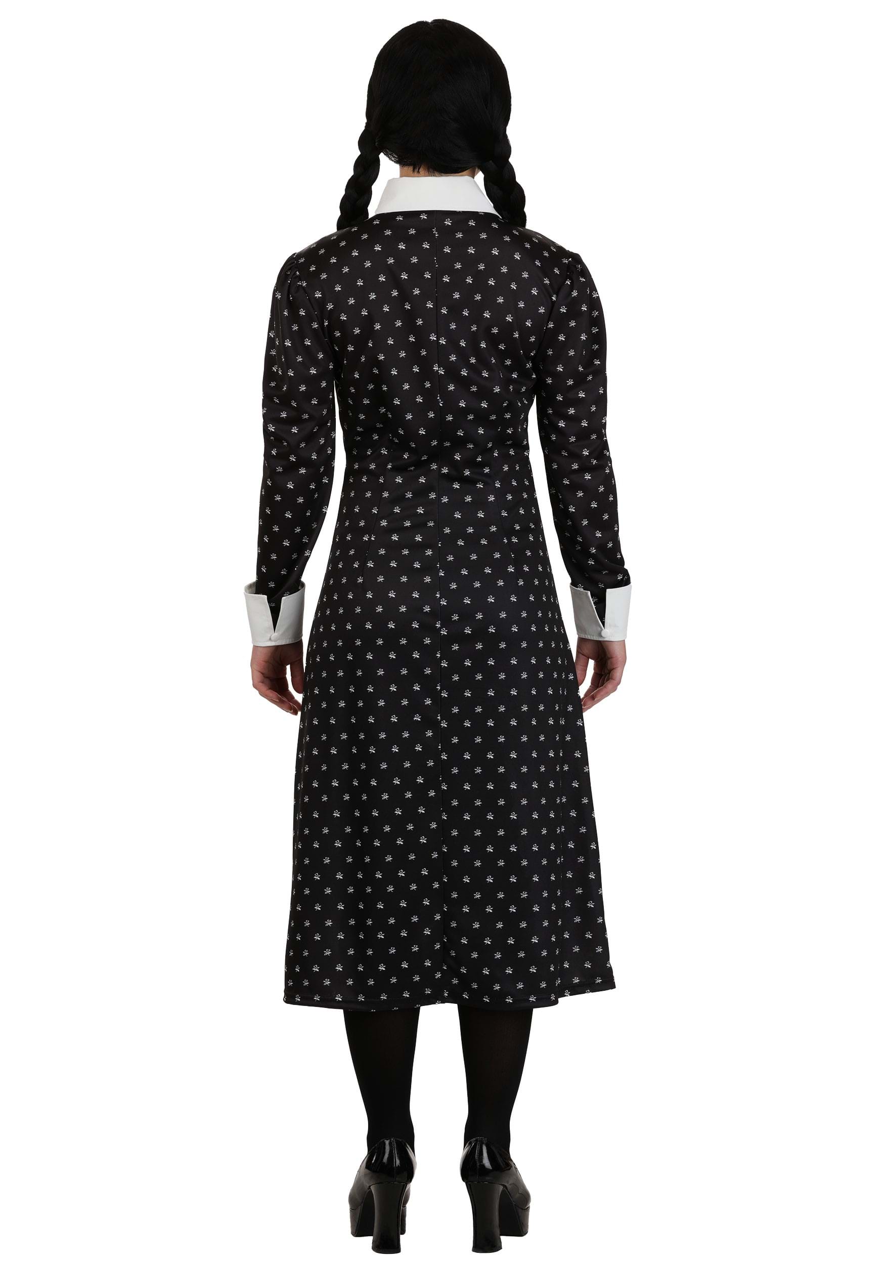 This officially licensed costume is designed to mirror the modern take on a cult-classic icon from the hit Netflix series. It’s made from a stretch knit fabric that offers comfort with a bit of structure, and features a full button-down front for a sharp, uniform look. Sublimated mini skull bow prints give the dress its subtle edge—perfect for anyone who appreciates pattern work that rewards a second glance.