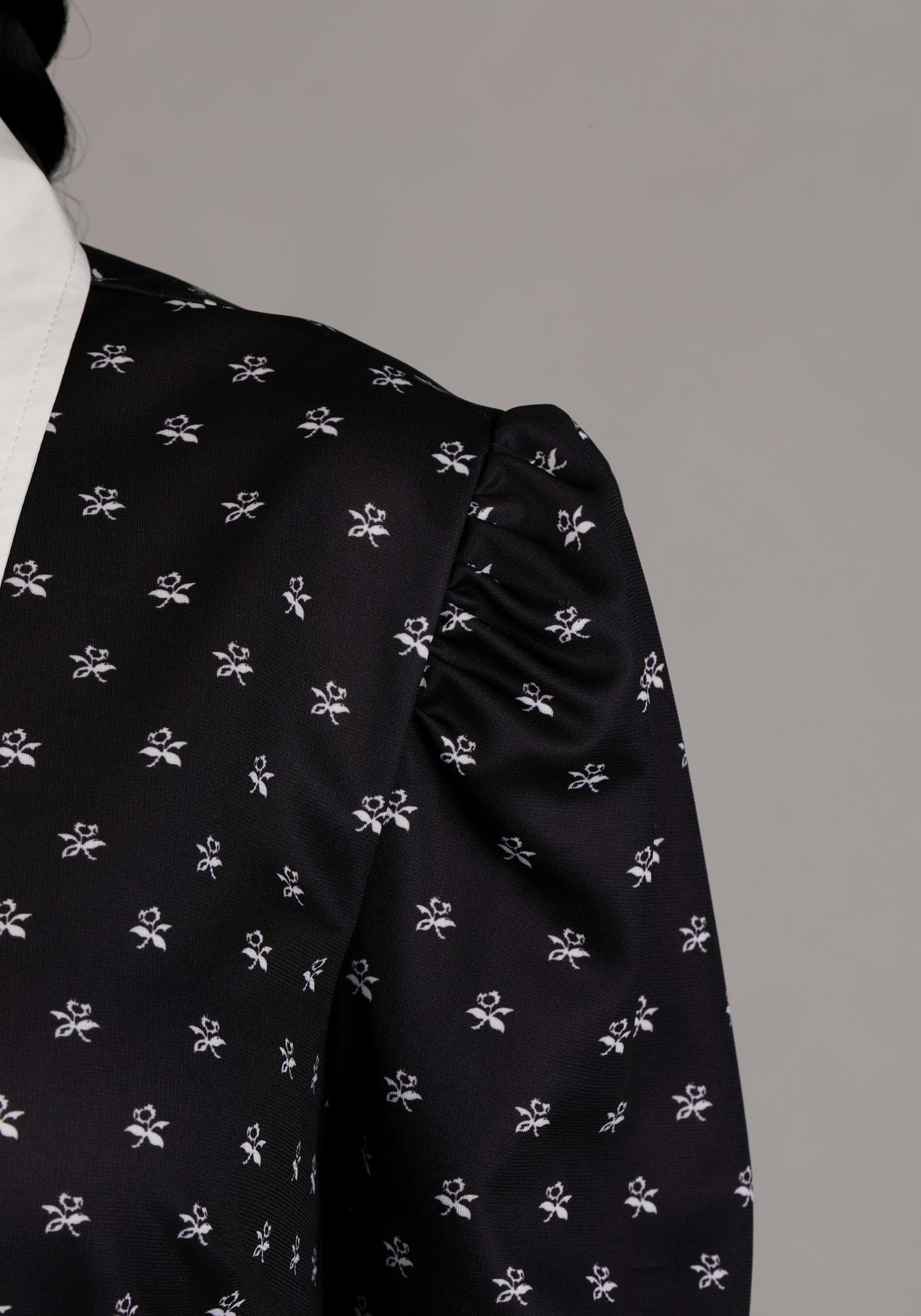 The white jersey collar and cuffs pop against the black base, lending that signature deadpan contrast that’s part prep, part predator. The cuffs fold cleanly at the wrists while the pointed collar frames the face with all the drama of a lightning-lit portrait. Equal parts eerie and refined, the dress is built to impress anyone who values precision, posture, and well-timed silence.