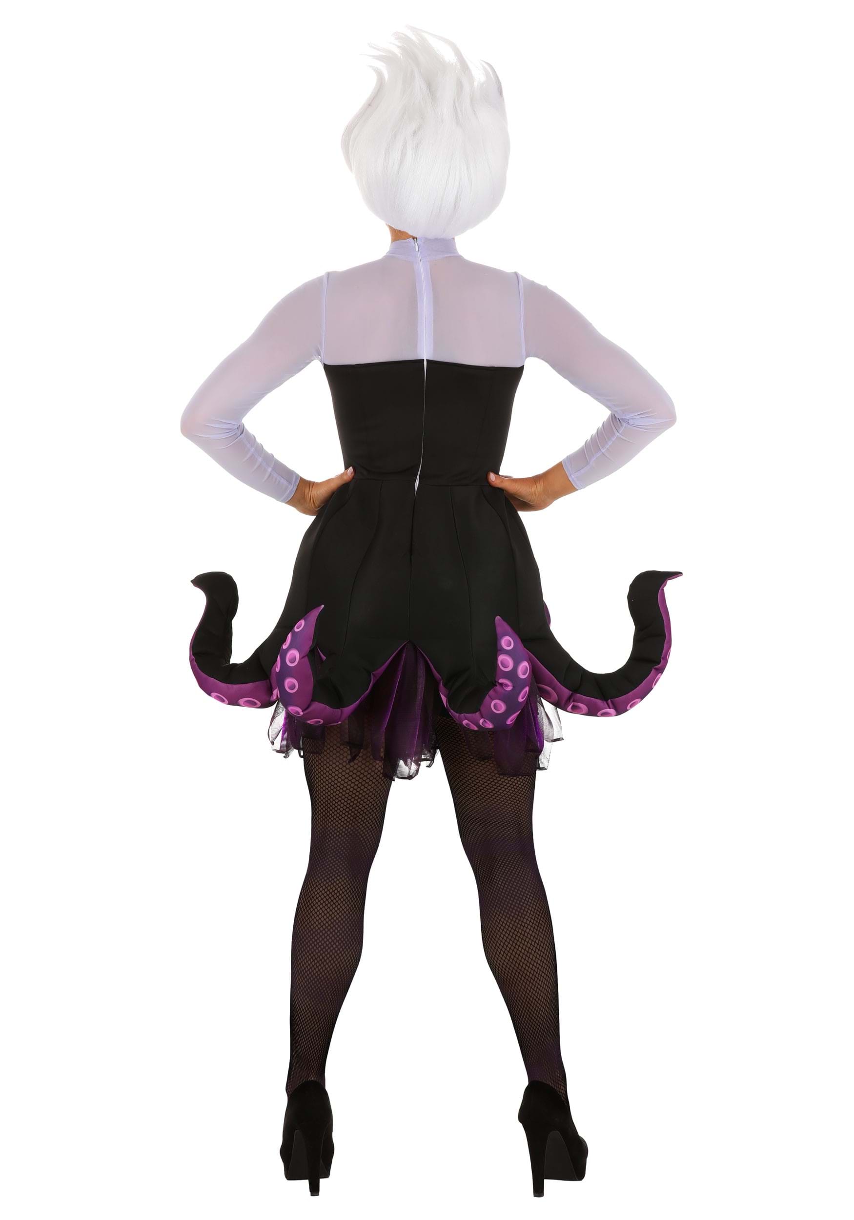 This detailed dress starts with a long-sleeved purple mesh top to imitate Ursula's look. The attached black bodice has an invisible zipper in the back and the skirt features tentacles with printed bottoms that are stuffed to hold their shape. Ruffles underneath create a sense of movement while the conch shell necklace completes this magical design!