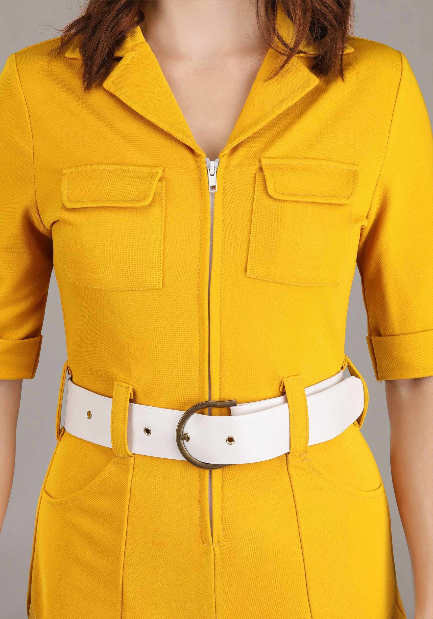- Stretch twill jumpsuit has zipper down center front, functional chest, hip and leg pockets, belt loops sewn on