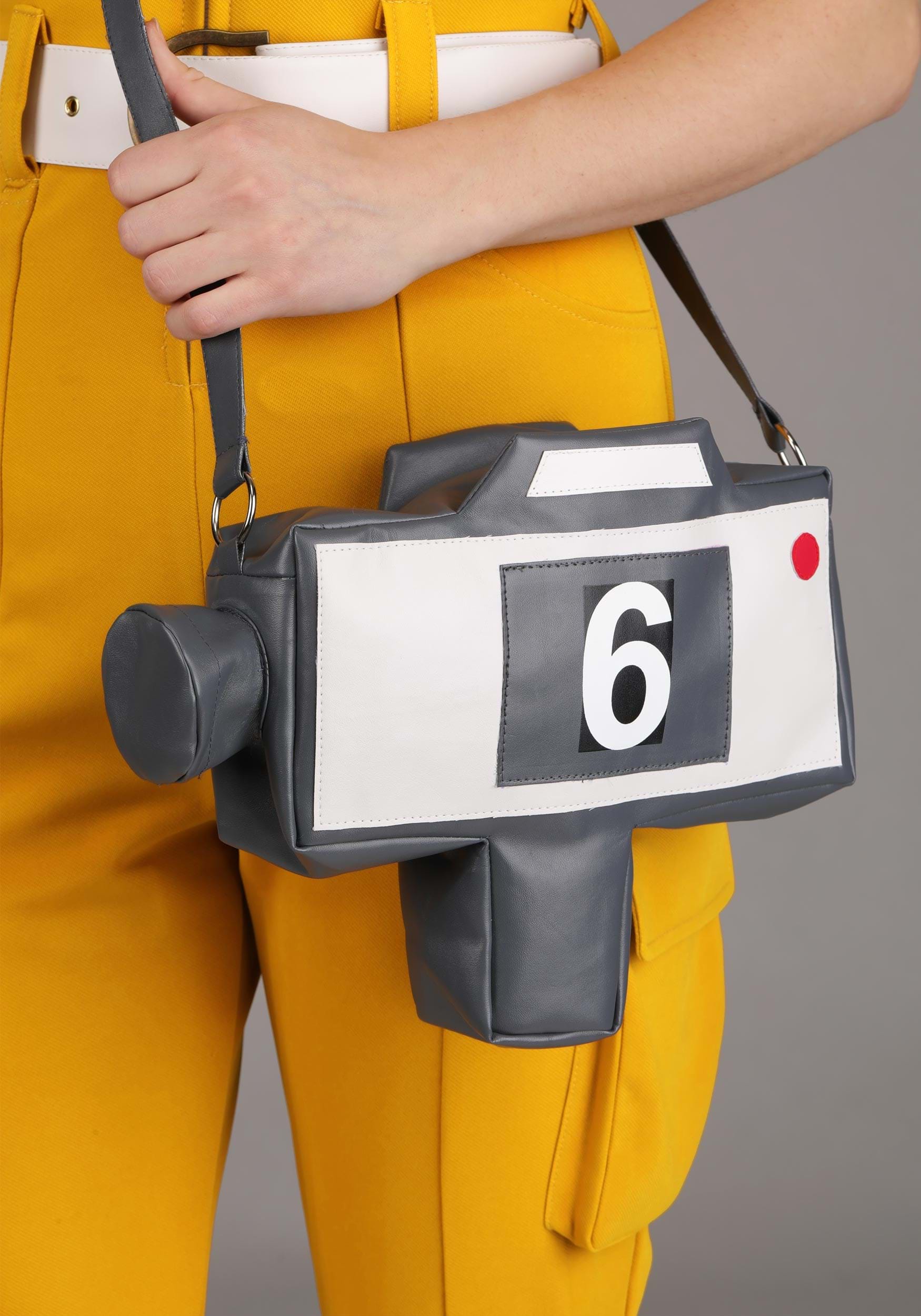 - Faux vinyl purse is shaped like a video camera, zipper along the side opens to a compartment, long shoulder strap