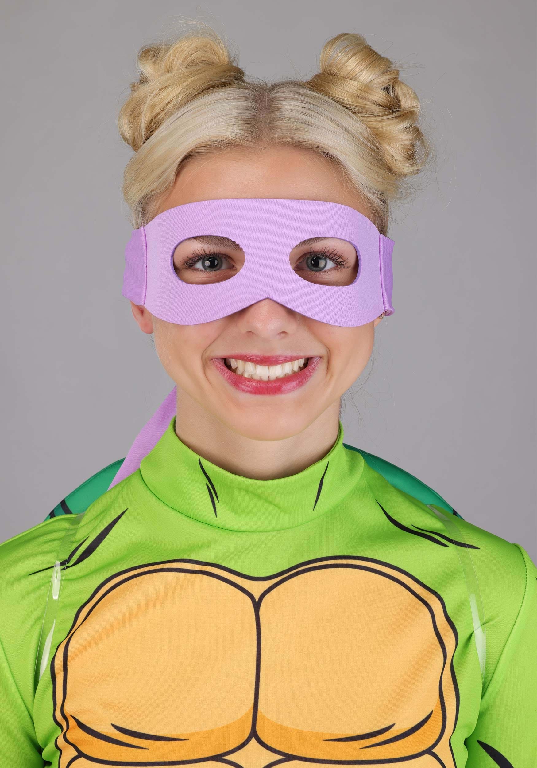 The costume includes a dark green turtle shell that secures with a translucent strap worn over the shoulders. It stays put while you tinker, troubleshoot, or quietly judge other people’s lack of planning. A purple eye mask ties around the head and pairs with purple gloves, knee pads, and armbands for the full genius-in-action look.