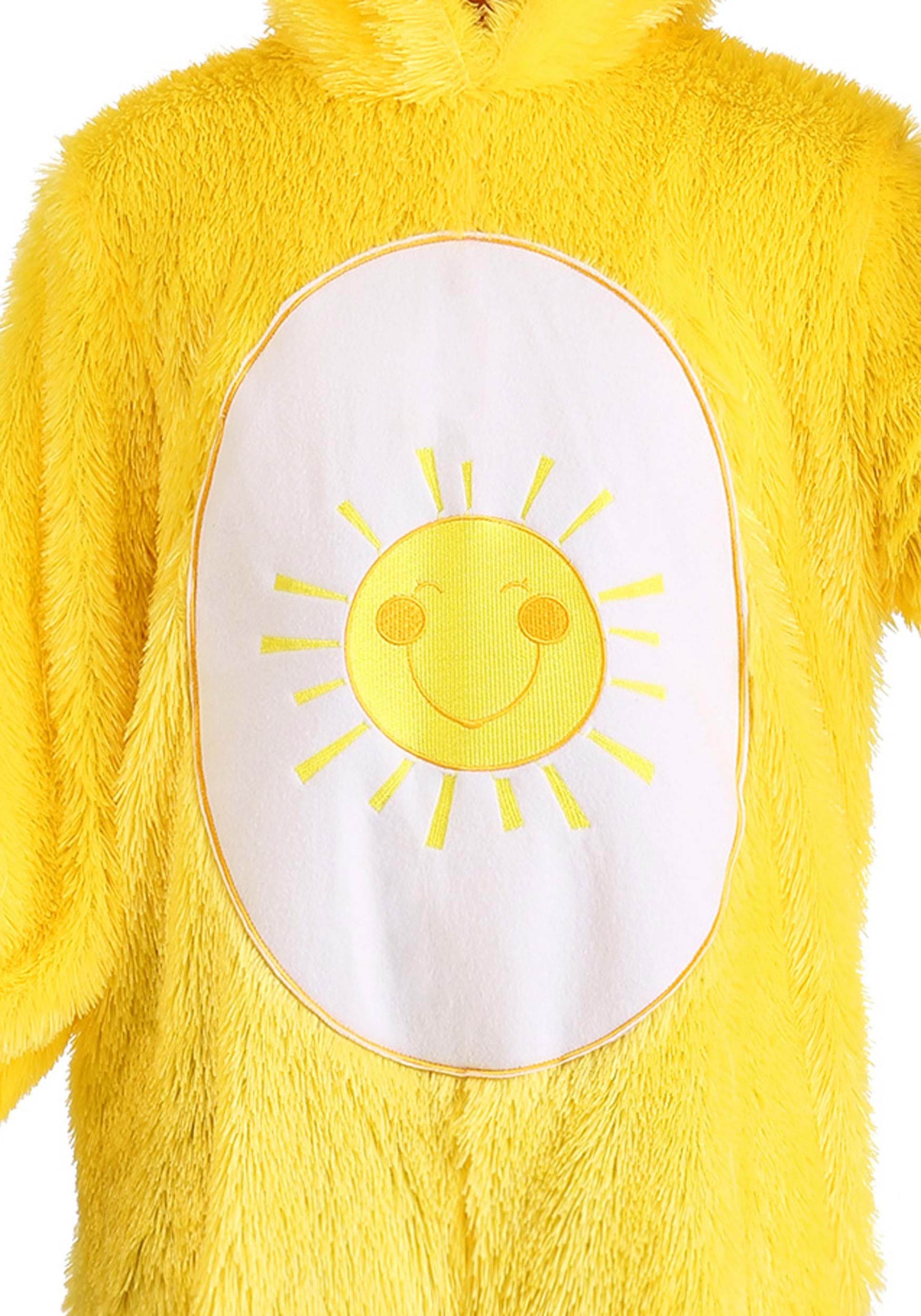 Prepare for those cheerful moments and more to come when you purchase our exclusive Care Bears Kids Classic Funshine Bear Costume for your chipper kiddo! The officially licensed jumpsuit transforms your happy-go-lucky kid into their Care-A-Lot counterpart, starting with its bright yellow faux fur. A large white patch in the middle of the suit features Funshine Bear’s signature sunshine belly badge and reflects your child’s ability to see the sunny side of life. With the attached hood pulled up, your kid’s sweet smile becomes Funshine’s under soft-sculpted ears and embroidered facial features. Attached mittens and matching shoe covers complete the look and promise to keep your kiddo walking on sunshine!