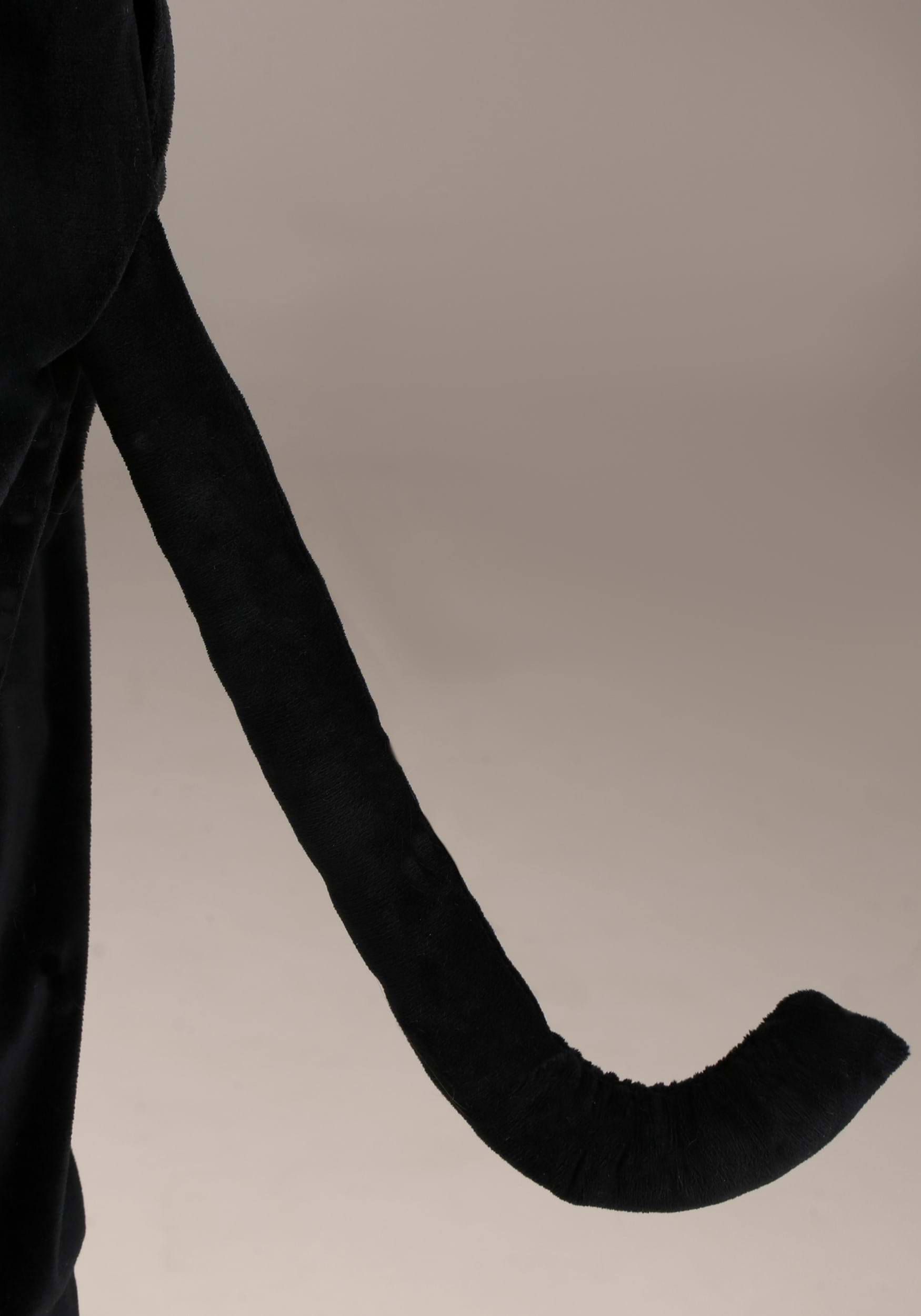 - Velour jumpsuit has faux fur belly inset, foam-backed bow tie at front neck