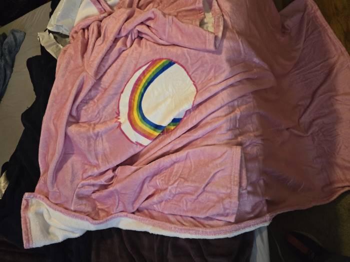 Get ready to channel your favorite bear's happy mood when you snuggle up in our Cheer Bear Wearable Throw! The oversized blanket is made from soft fabric in the same pink as Cheer Bear's fur, with her signature rainbow belly badge on the front. The large sleeves and extra length on this officially licensed throw make it extra easy to get cozy!