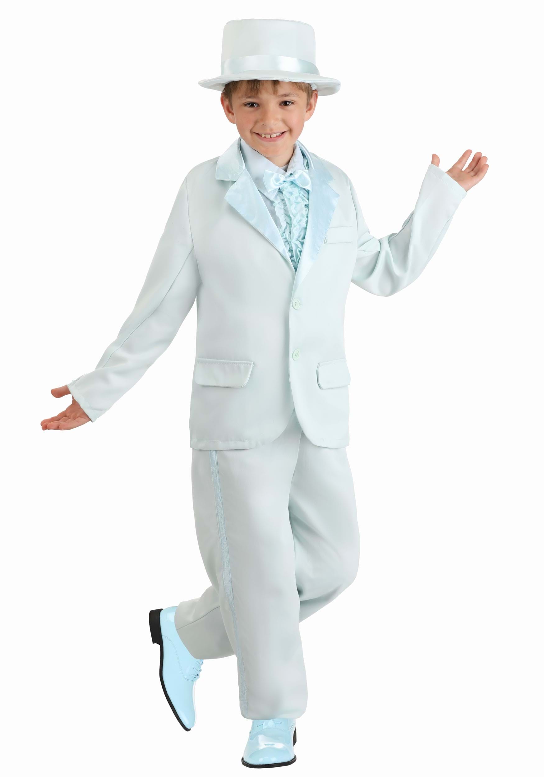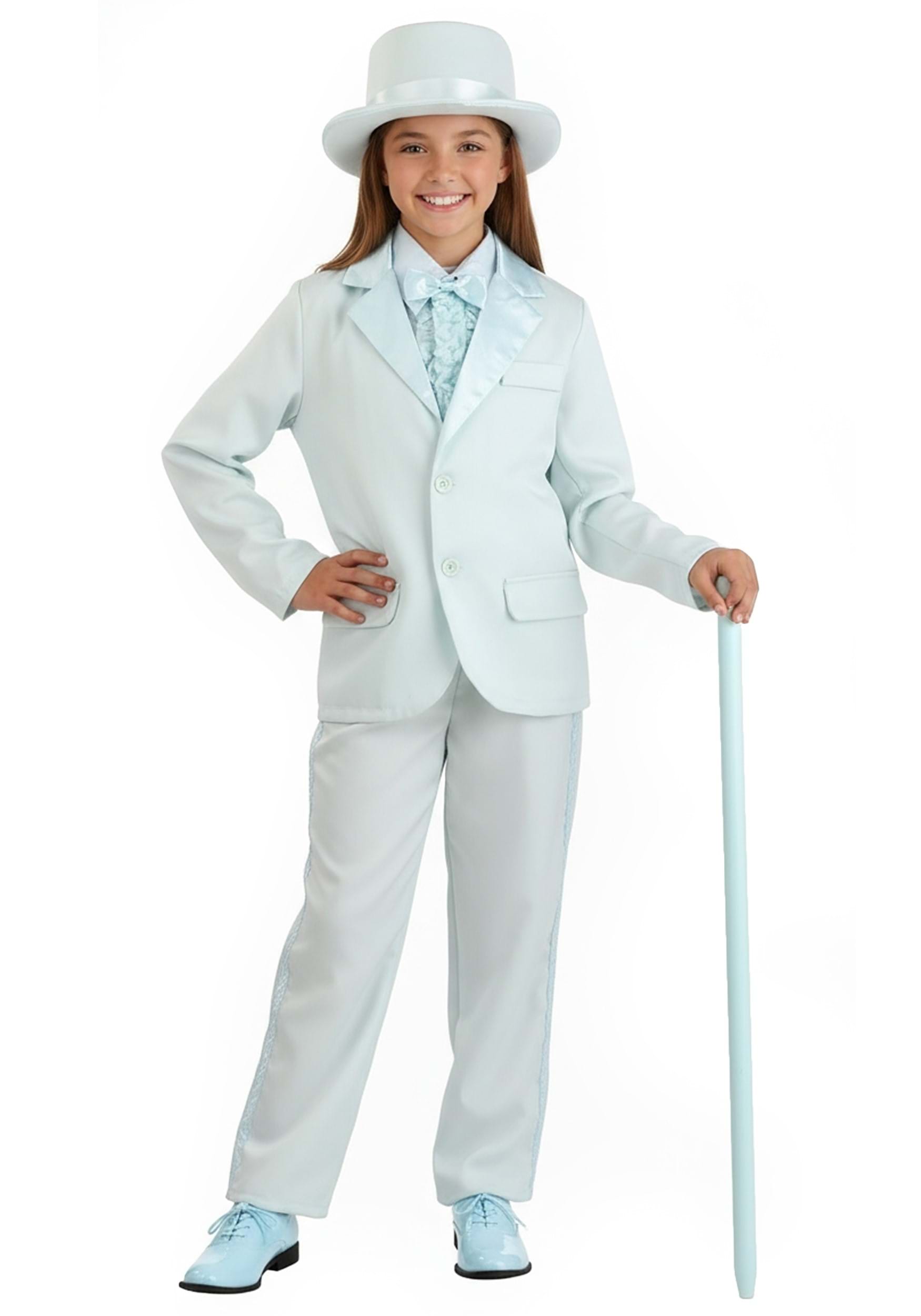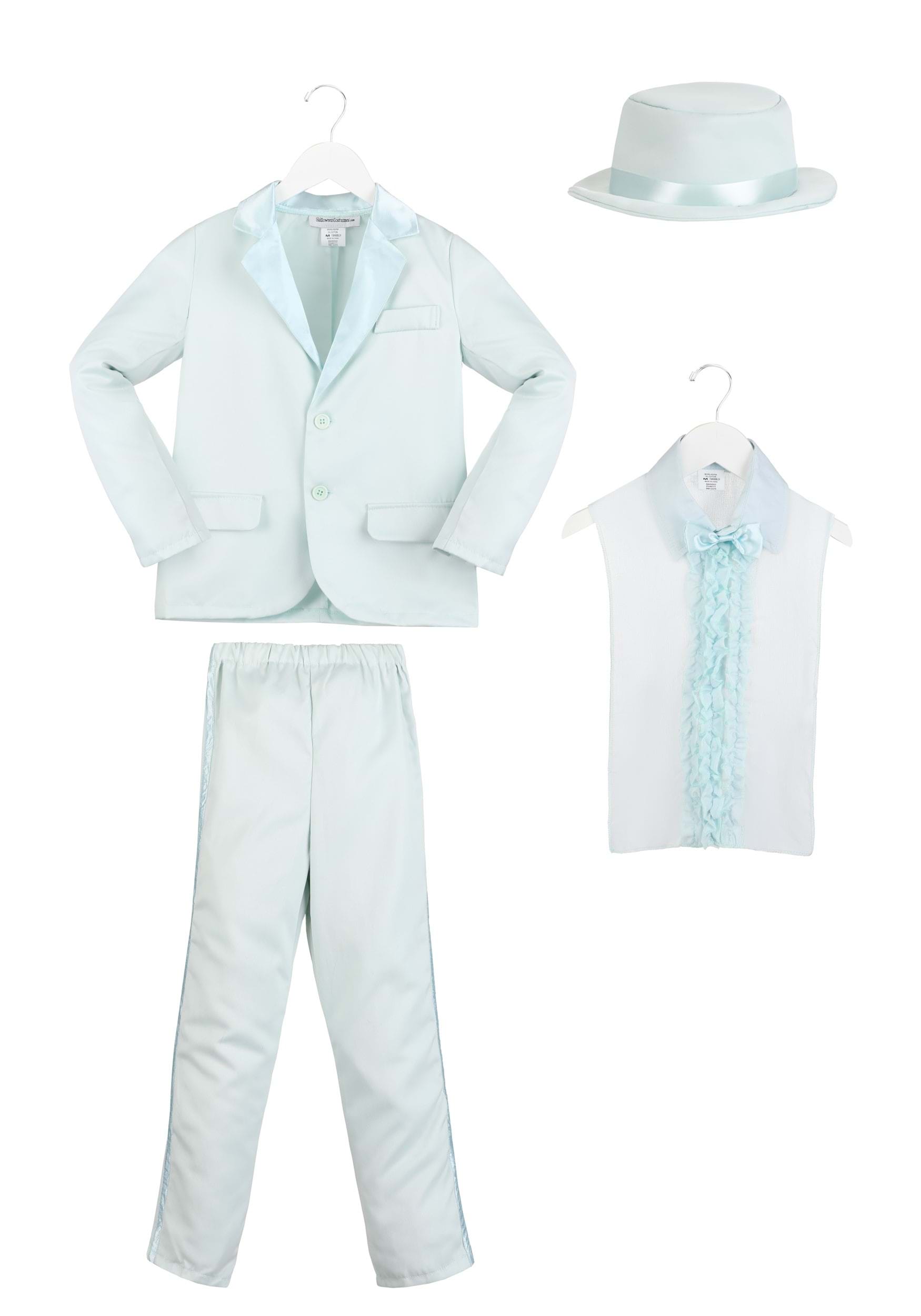 It's time for some seriously light hearted fun in the only way that we know how to do it. That means letting your kiddo enjoy the day in this Child Blue Tuxedo. This sky blue suit is precisely what your inner heart is hoping for, a lovely jacket complete with off blue lapels and a matching tie. The top hat features a shining blue ribbon belt to finish off this perfect look.