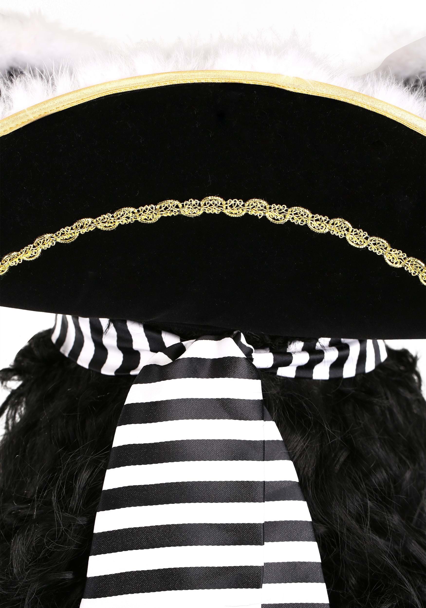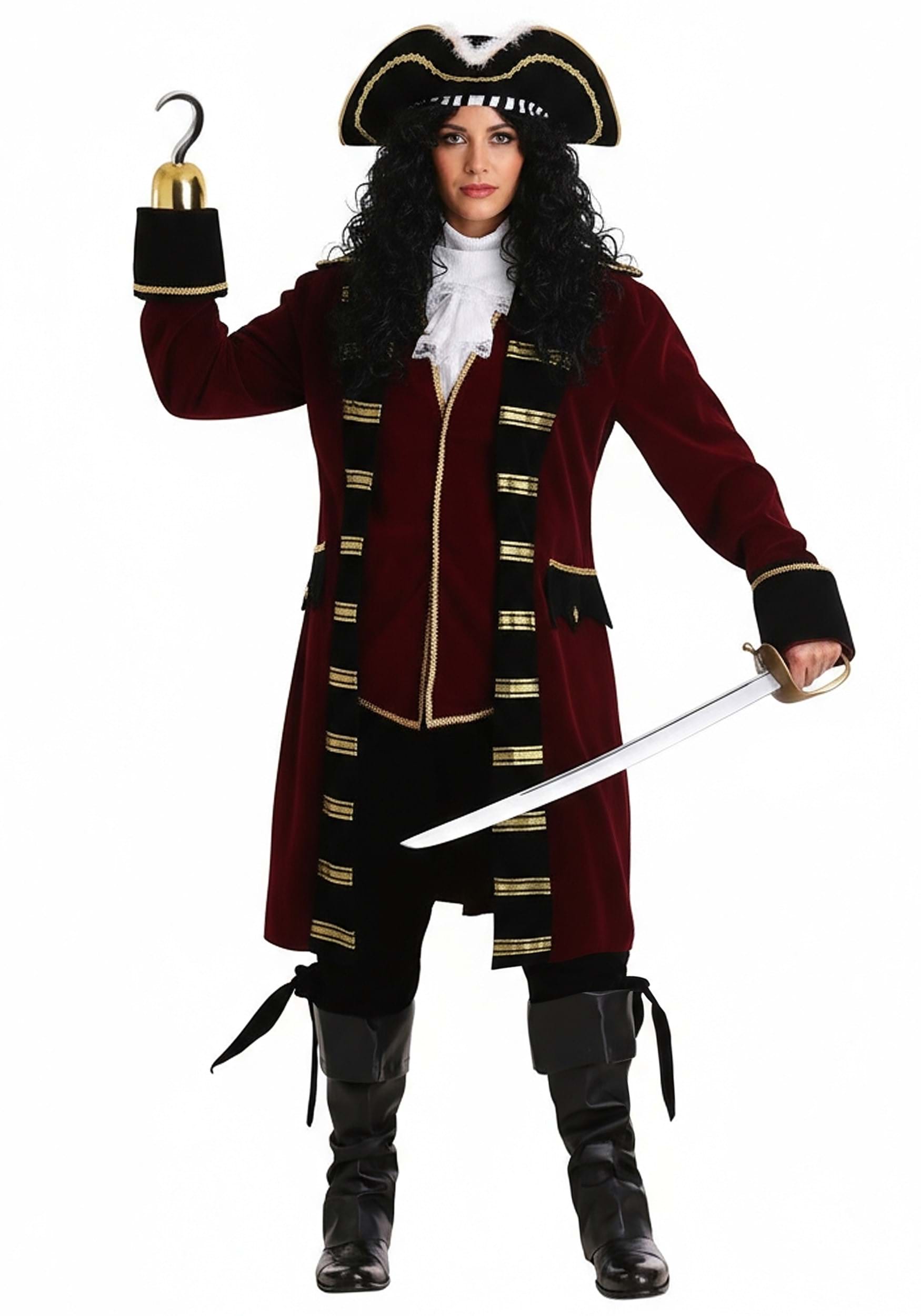 This Deluxe Captain Hook Plus Size Costume comes with everything you need to feel like the delicious- er, we mean deadly pirate Captain Hook! From the red velvet jacket to the shin length black knee pants, You'll have anyone who sees you shaking in their boots. The faux leather boot tops are perfect for sliding over your own shoes, and the tricorn hat is a necessity for this pirate! All you will need is your hook, and you will be all set.