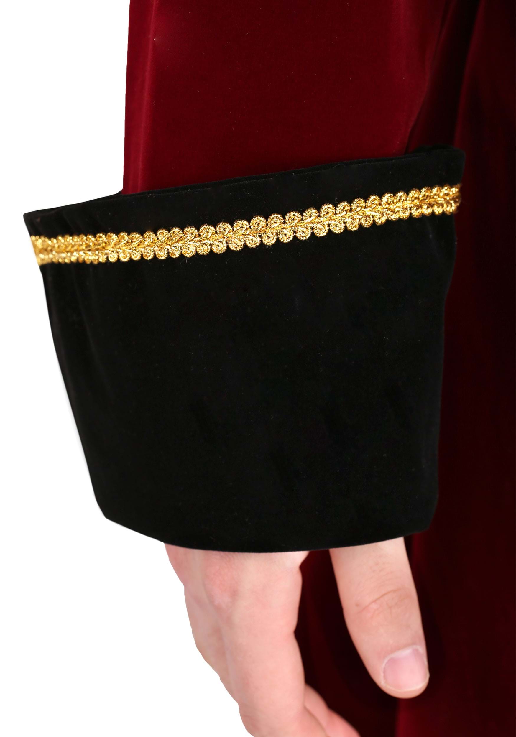 - Maroon velvet jacket has black velvet collar, lapels, sleeve cuffs, and false pocket flaps