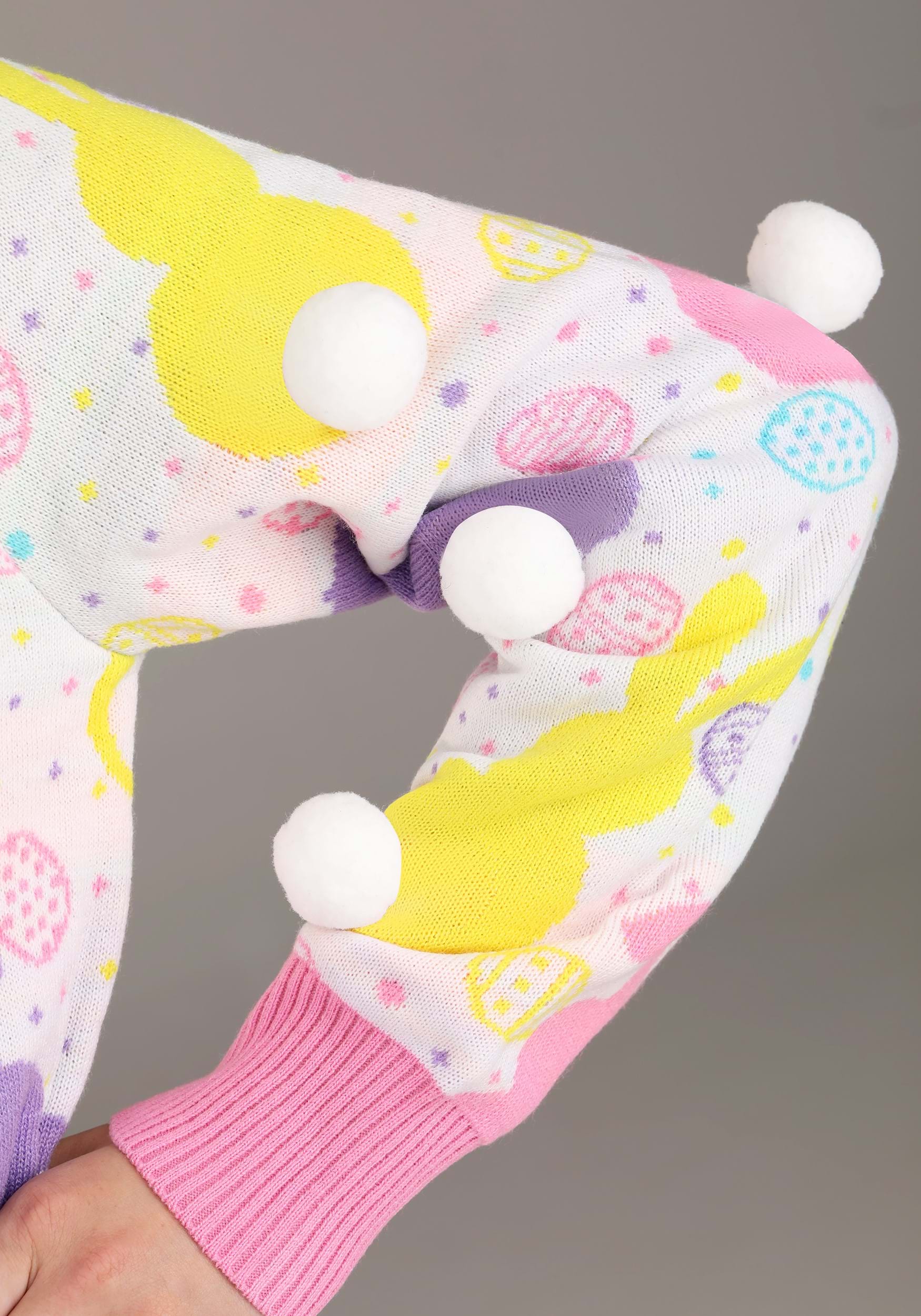 This adorable Easter Bunny Ugly Sweater was Made By Us so you can help out the mascot himself this spring! Whether you’re trying to hide eggs or find them, you’ll feel up to the task in this festive sweater. It has an all-over print of Easter bunnies and decorated eggs in soft pastel colors with matching pink knit cuffs. The rabbits even have real cotton tails! We hope this cute sweater will bring you the spring spirit and get you feeling ready celebrate whenever you put it on!