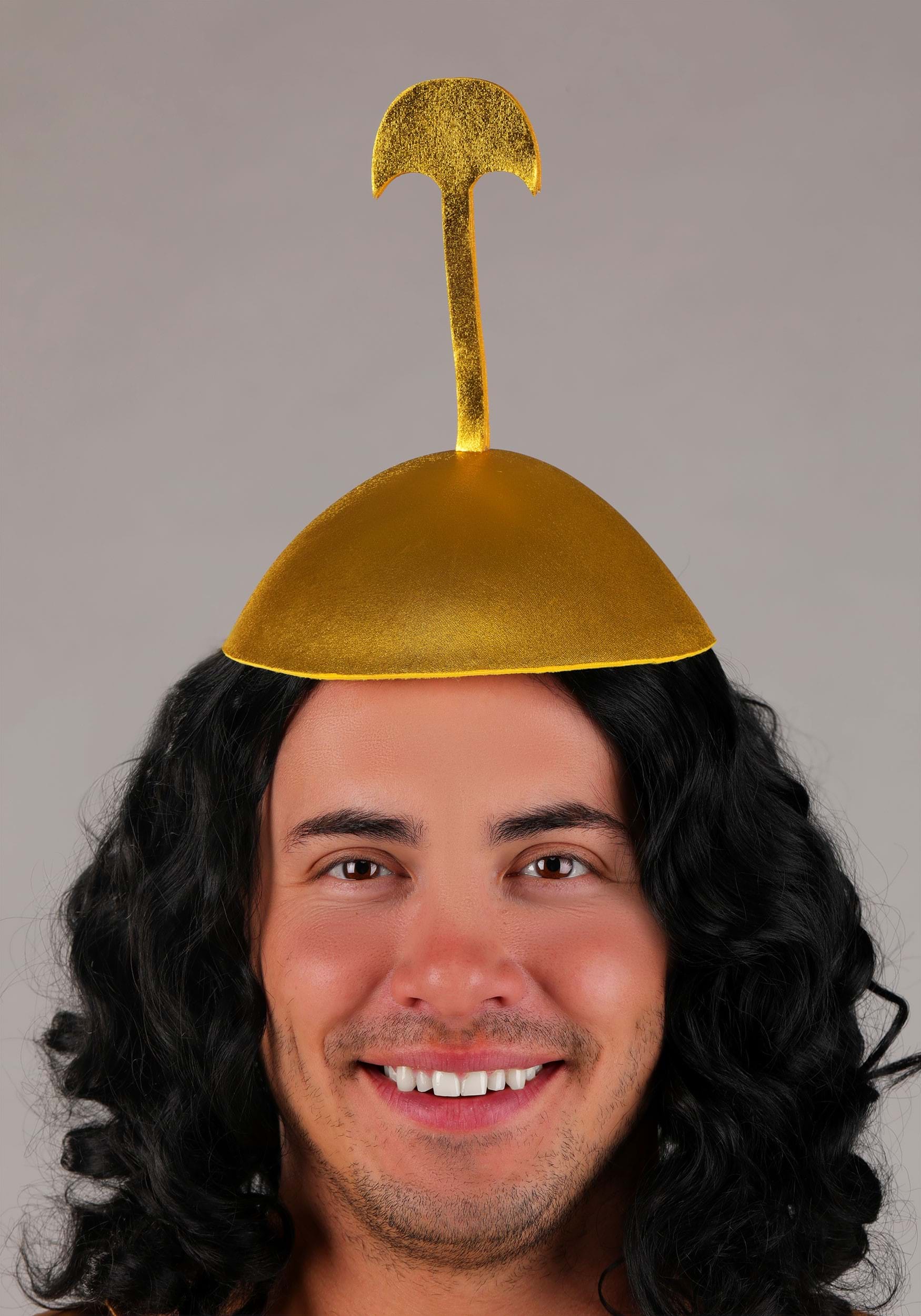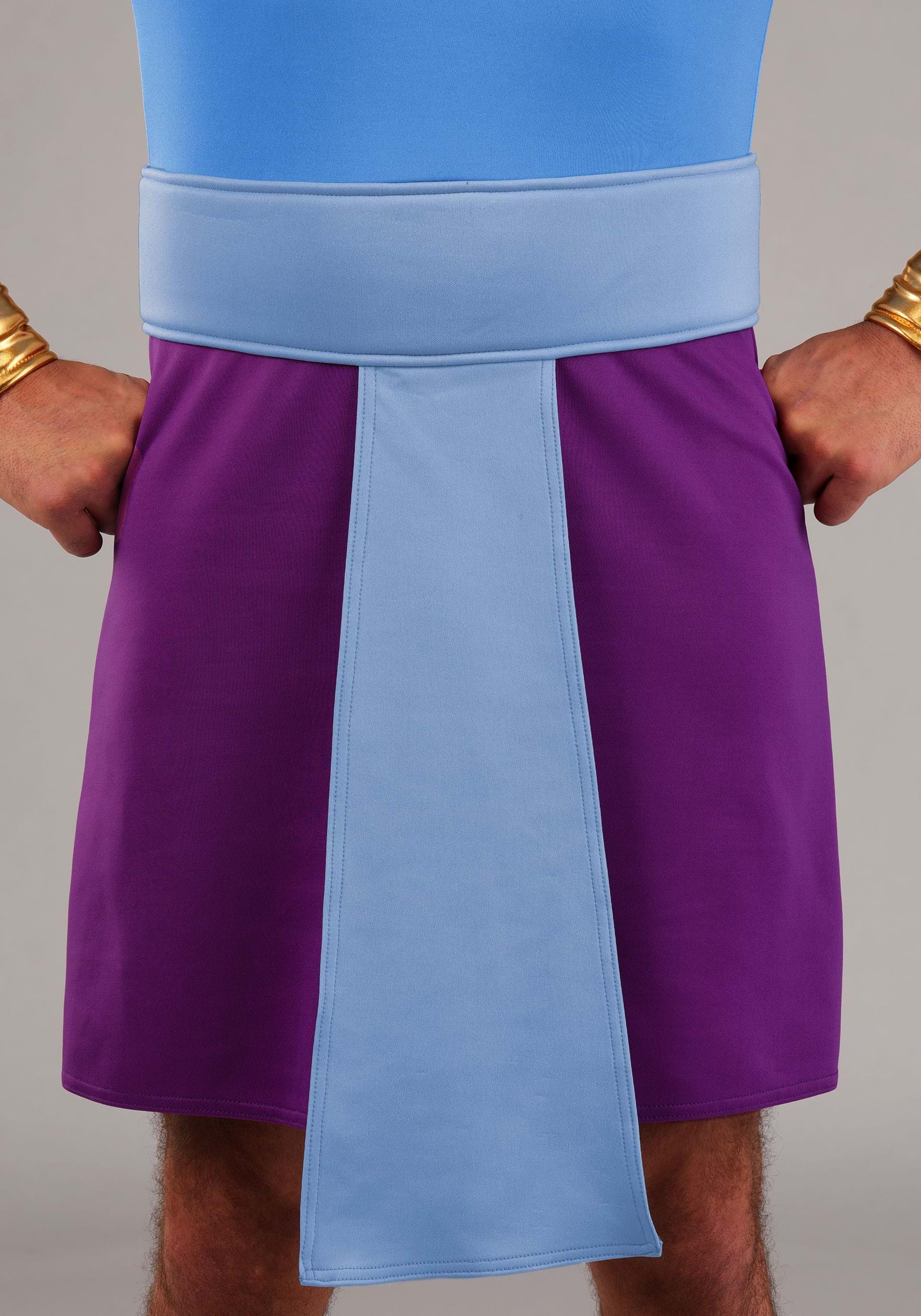 A sleeveless pullover tunic with hook-and-loop closures in the back starts the look. Slight padding in the chest provides a muscular look, while the tunic's length and color-blocked design ensure it looks just like Kronk's two-piece outfit. Metallic gold fabric wrist and ankle cuffs secure with hook-and-loop fasteners. A matching cap and hook-and-loop fastened belt sash complete the look.