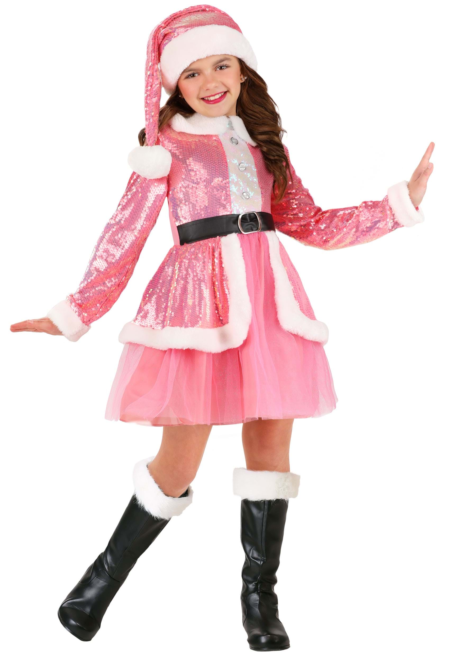 Topping it off is a matching pink Santa hat trimmed in faux fur and finished with a white pompom. It keeps the holiday spirit high while giving the whole outfit a polished, picture-perfect finish. Boots not included, but let’s be honest—any shoes will look better when paired with this much glitter.