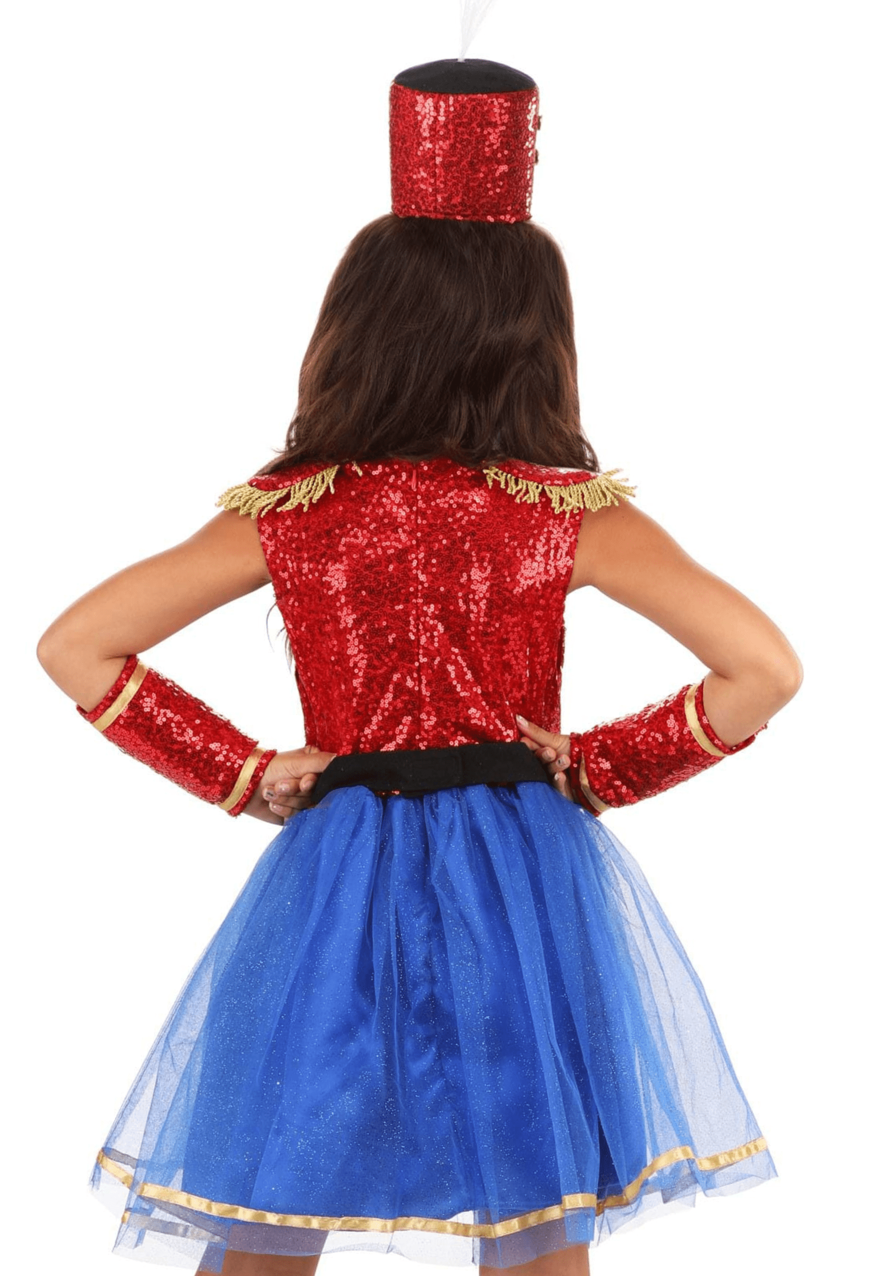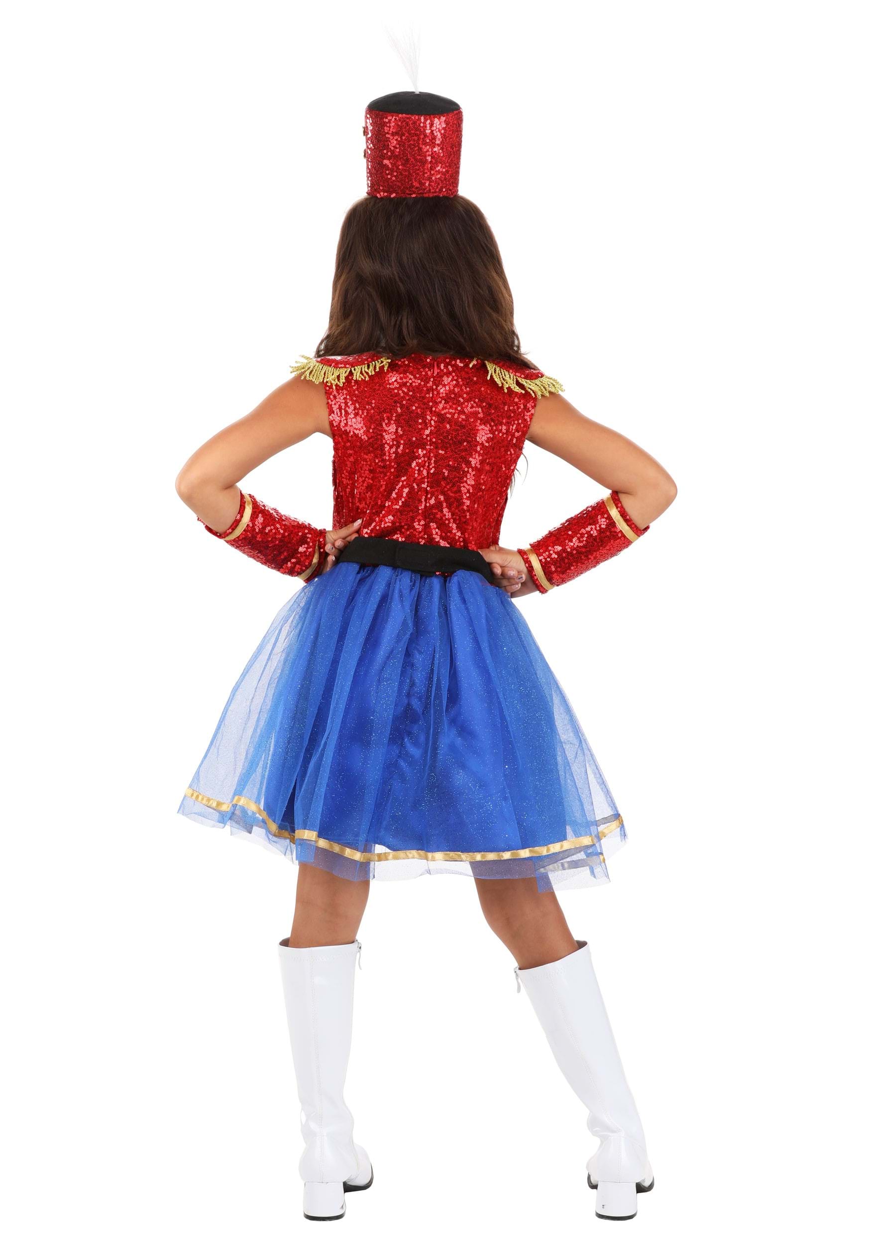 - Sequins and lycra dress has zipper down center back, gold trim, decorative buttons, epaulettes with fringe