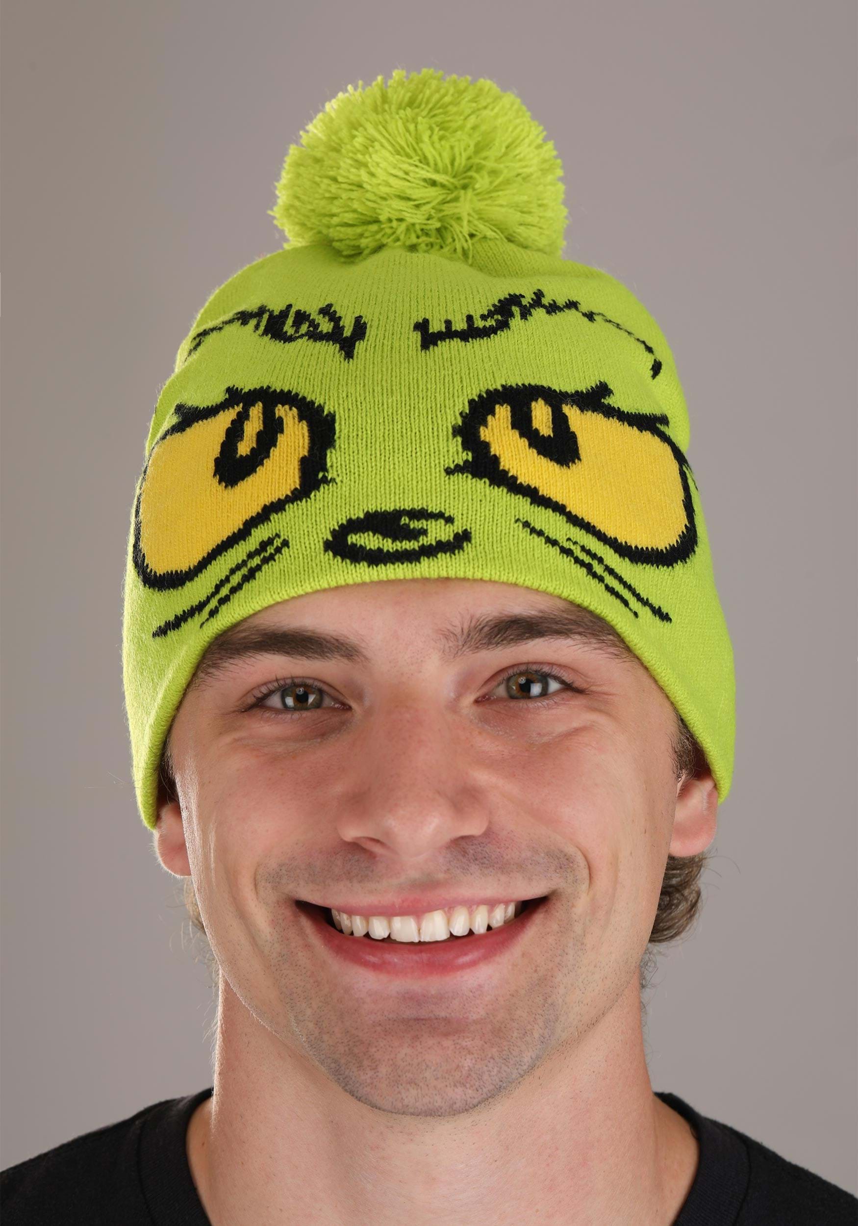- Knitted in Grinch face on front of hat