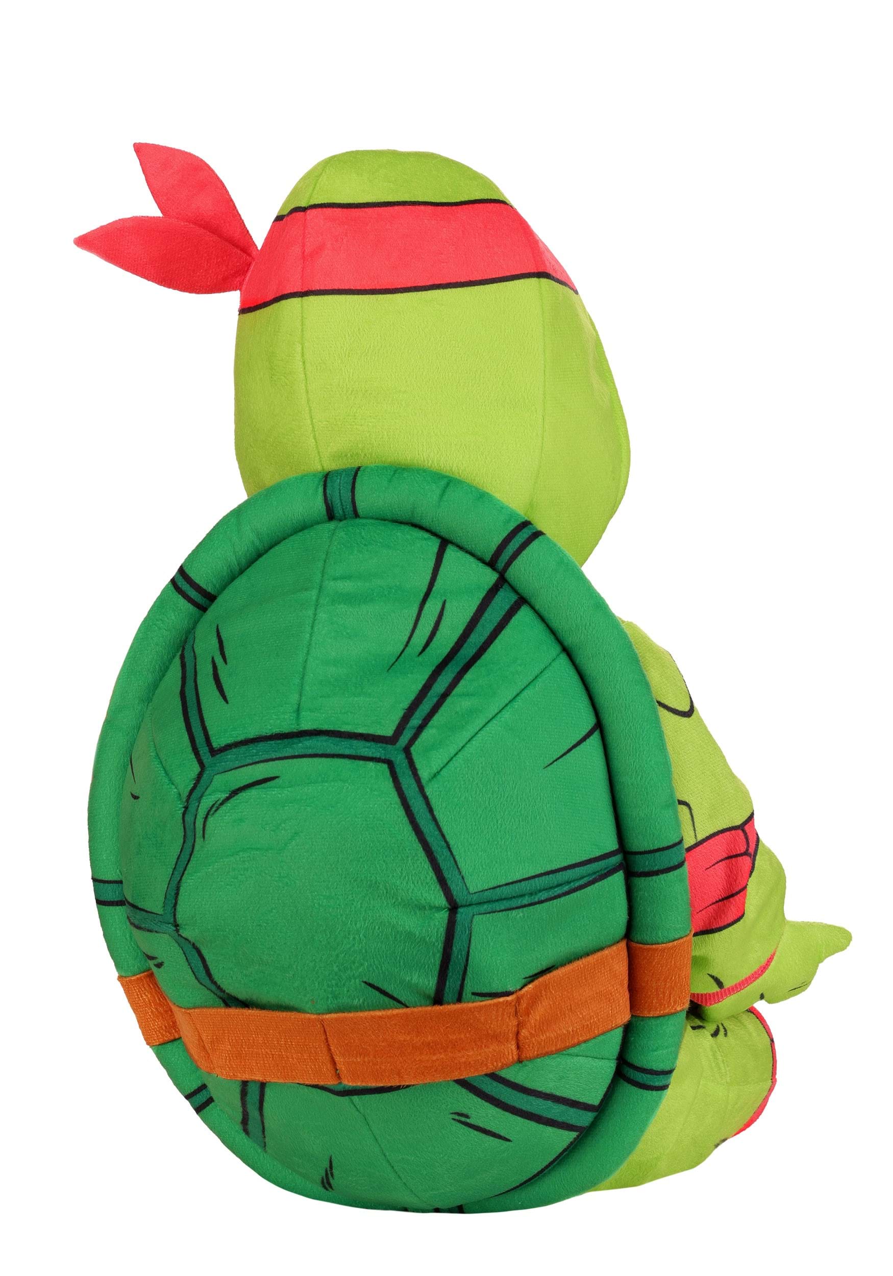 It’s fully printed with red knee, elbow, and wrist wraps, a front shell design, and a brown belt with a bold “R” smack in the middle. A matching red bandana is printed right on the hood, which also includes Raphael’s eyes and little side ties that bounce with every dramatic baby head turn. Down the back, a soft green shell attaches with hook-and-loop fasteners to complete the transformation.