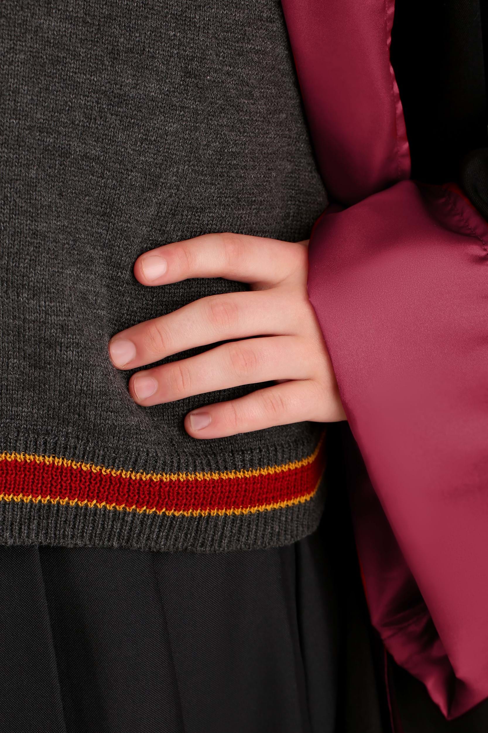 This Kid's Deluxe Harry Potter Hermione Costume is an officially licensed outfit from the Harry Potter movies. It's designed to recreate the Hogwarts outfit that Hermione wears and comes with a robe, a sweater, a shirt front, a skirt, and a tie. The full-length robe is black with a satin, burgundy interior. The front of the robe closes with a button and loop clasp on top with an attached, oversized hood in the back. It even features a Gryffindor crest right on the chest.