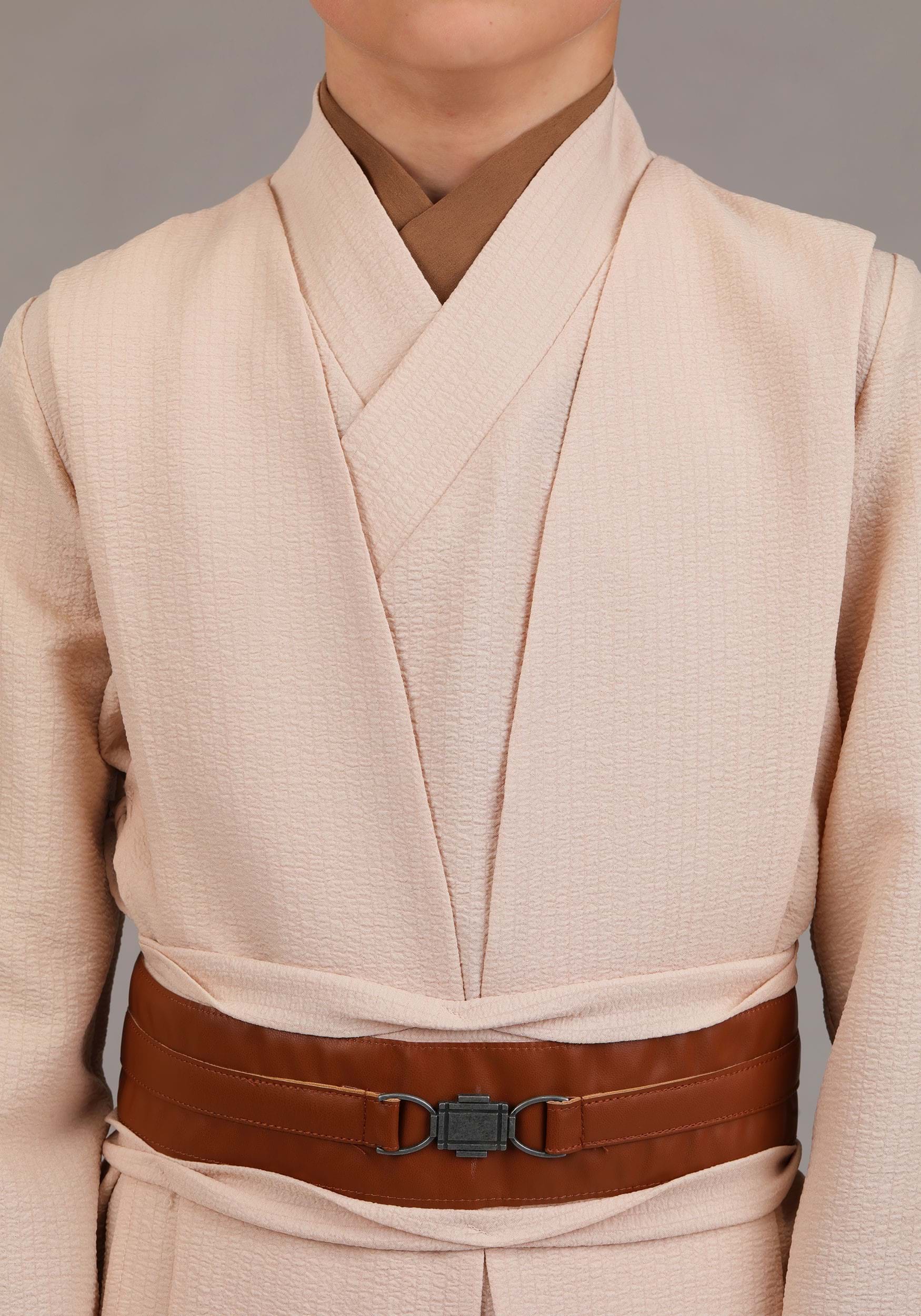 This officially licensed Star Wars kids Jedi costume starts with a hook-and-loop fastened dickie and an opaque gauze tunic. The tunic pulls on like a standard robe and secures with tie closures on either side. Attached decorative panels drape over the front of the wrapped tunic, giving it the standard layered look Jedi wear.