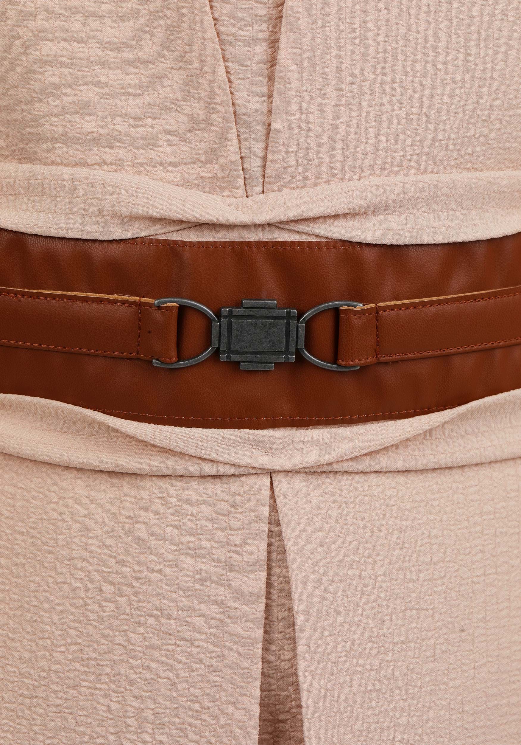 Elastic waistband pants made with polycotton materials ensure fuss-free dressing and easy styling. Meanwhile, a brown vinyl and gauze-backed belt pulls the look together! When secured in the back with hook-and-loop fastener tape, the belt comfortably cinches the waist, giving the costume a more structured look and adding a modest bit of polish with its steel-grey hardware.