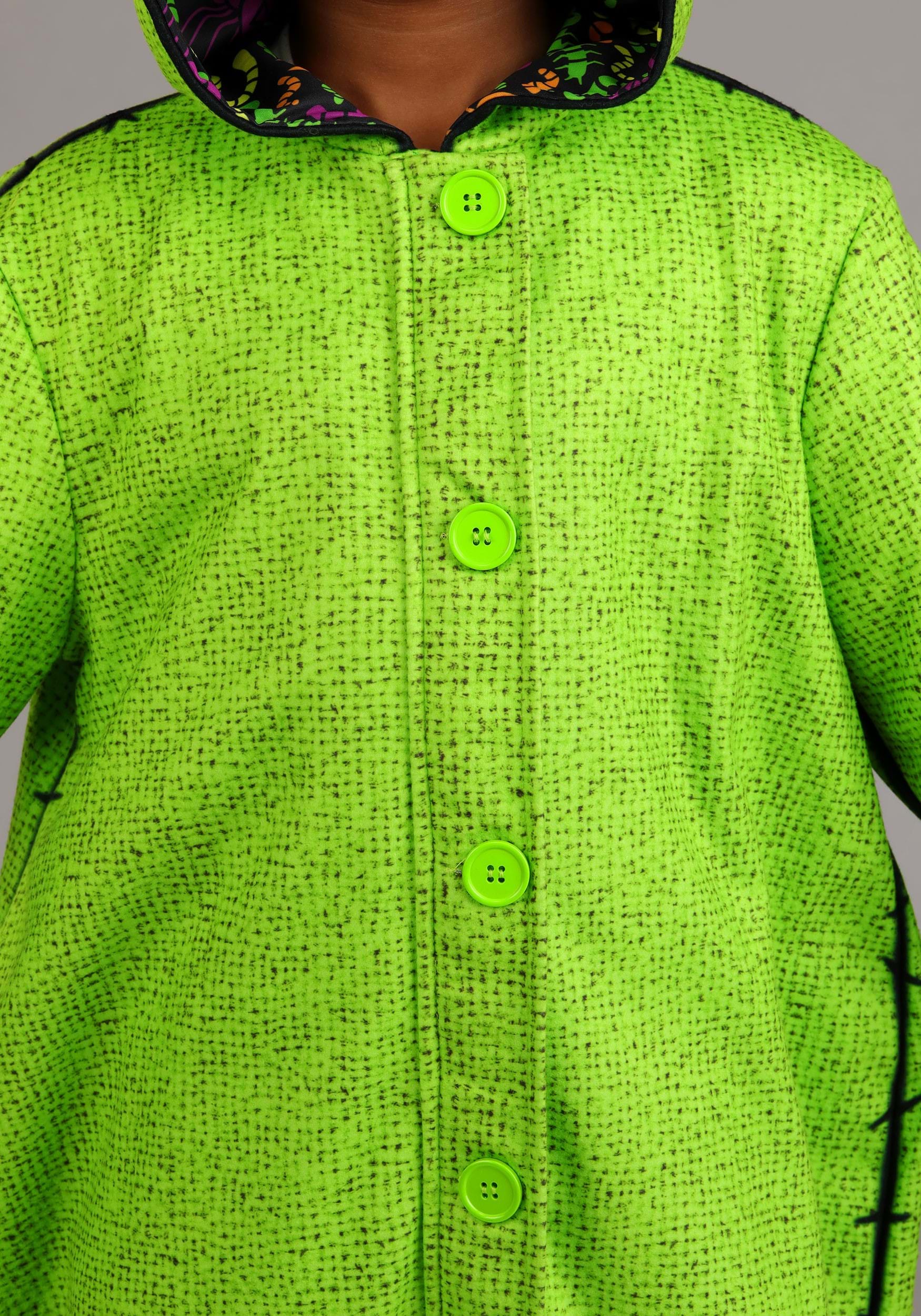 Crafted from warm fleece with a burlap-texture design, this costume has fun details like a bug-printed hood lining, embroidered face features, and stitched accents. Flip-back gloves and elastic booties keep kids comfortable while they're in character. Perfect for a night of trick-or-treating or a cozy movie marathon!