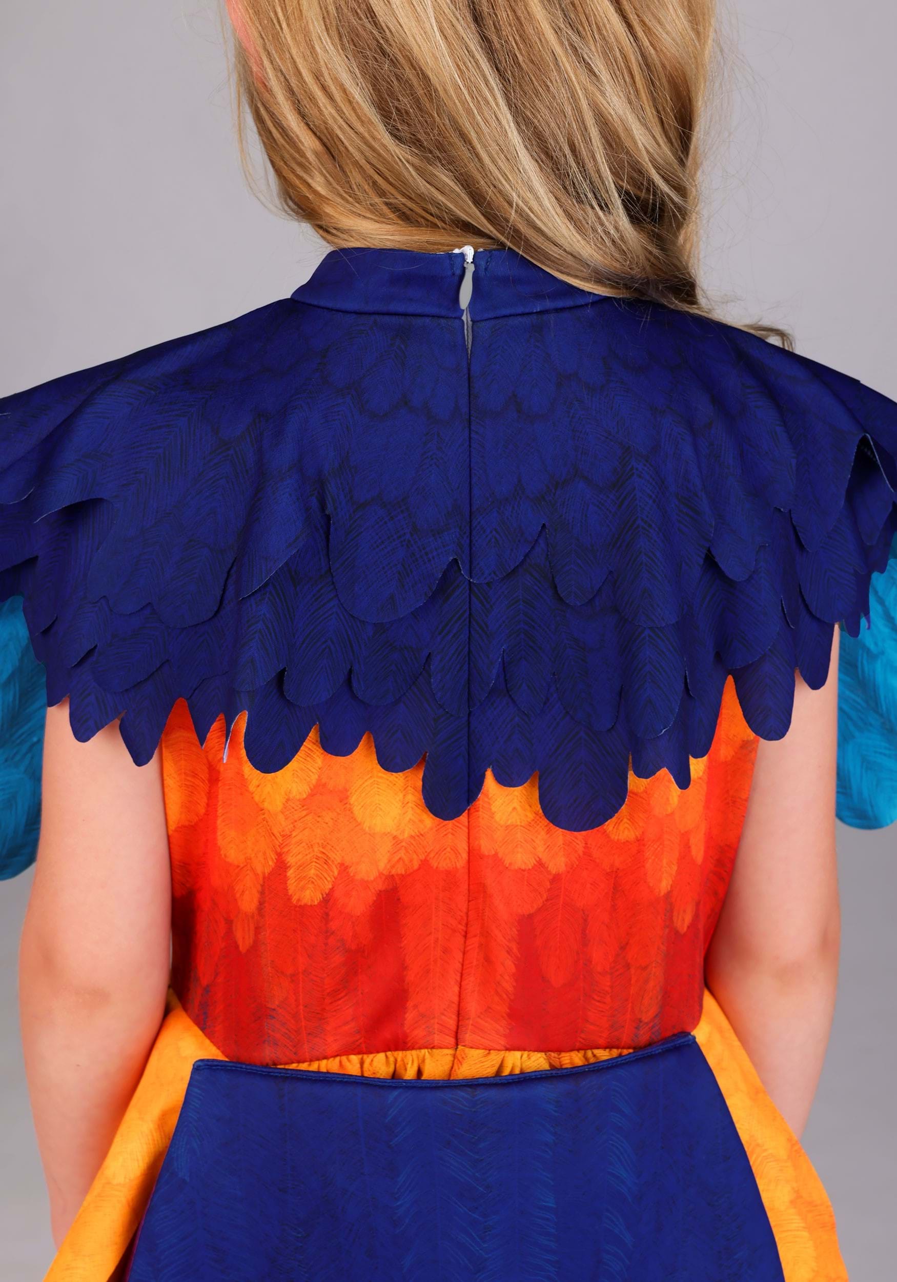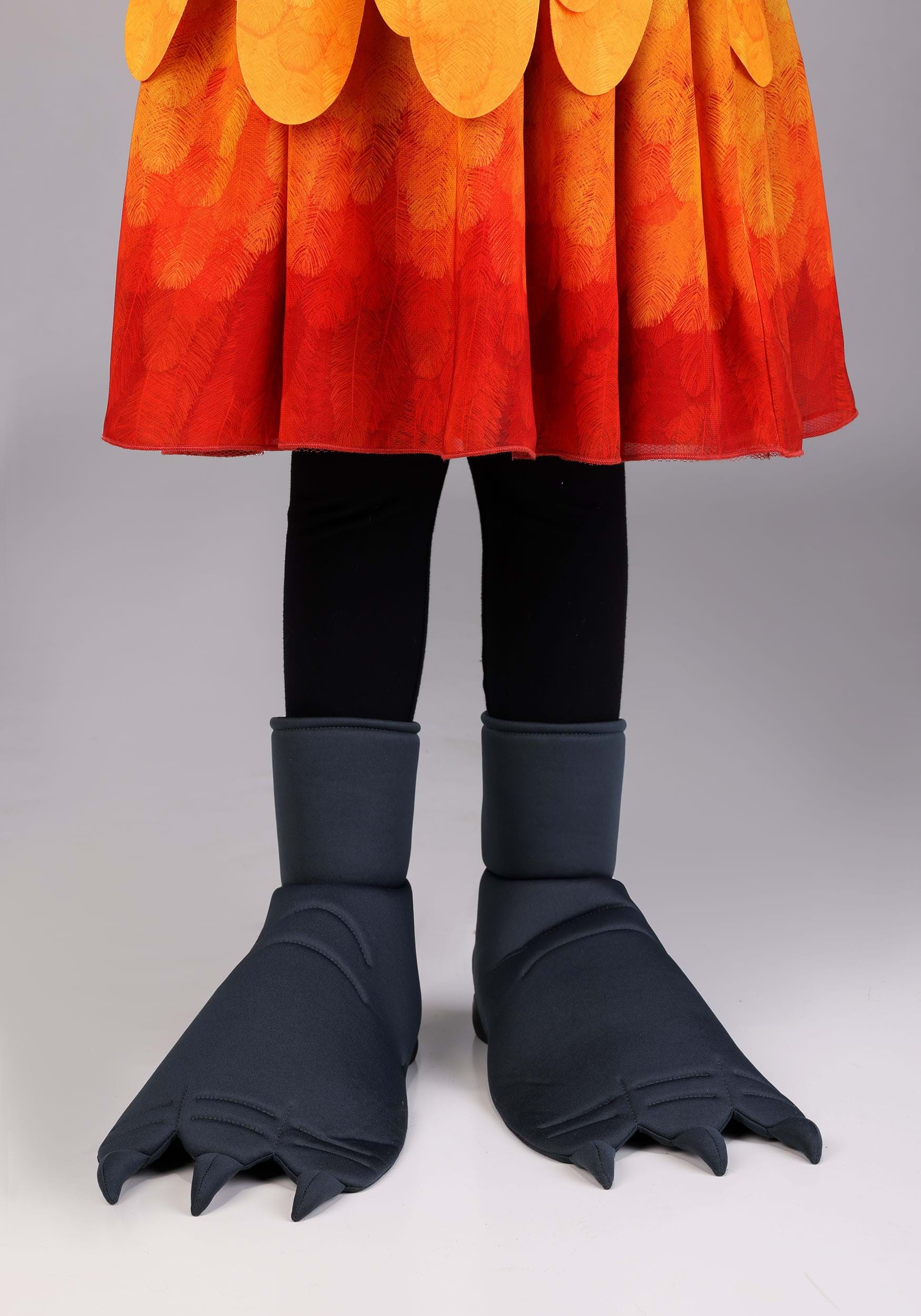 This costume dress captures Kevin's vibrant style with layered colors, fluttery feather shapes, and soft foam touches. The printed jersey knit fabric is comfy and soft, foam-backed foot covers add extra detail. A playful bird hat with character eyes and a plush orange beak finishes the look.