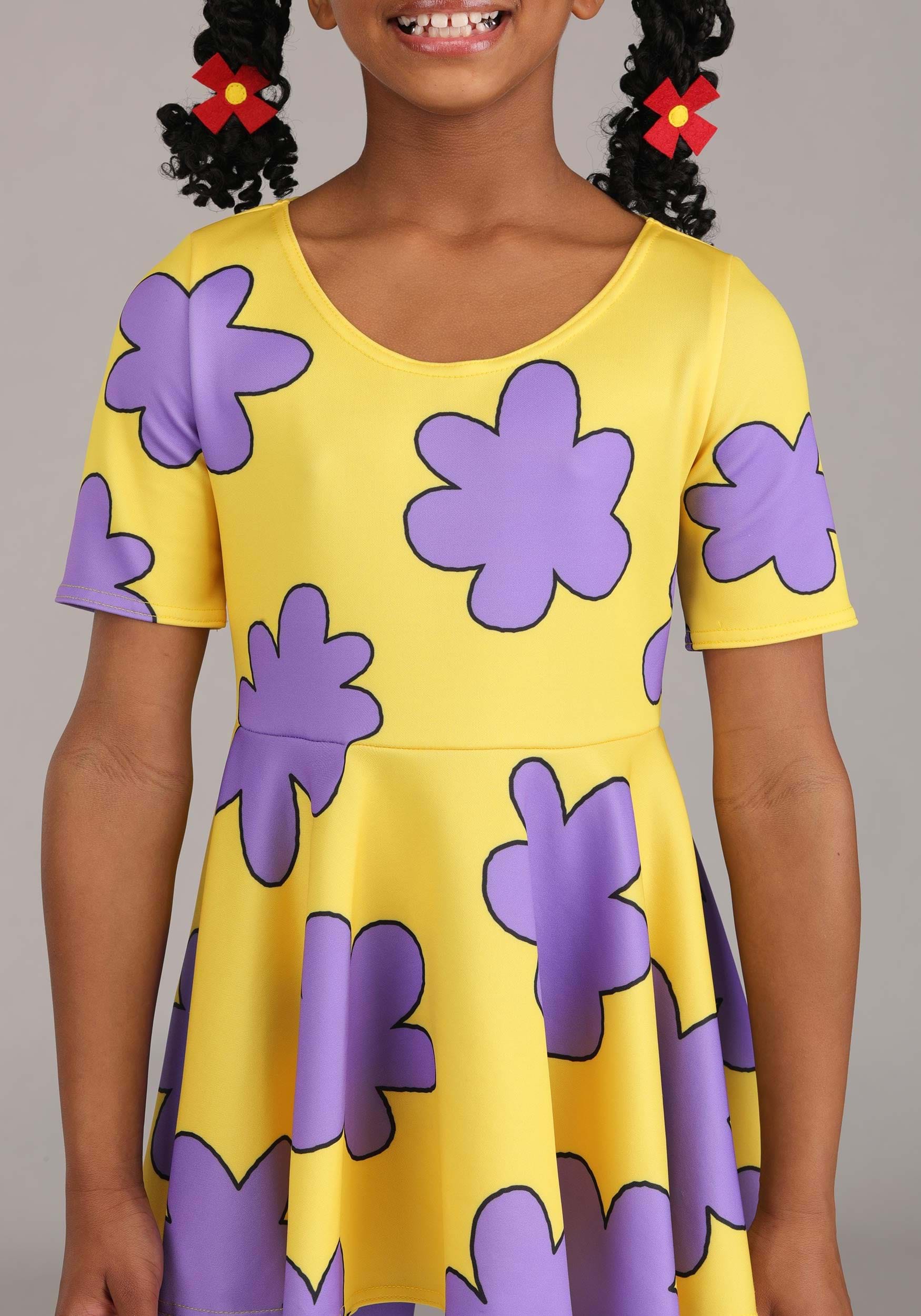The costume includes a yellow scuba-knit dress with a bold purple flower print that matches Susie’s look from the animated series. The fabric holds its shape without feeling stiff, and the short sleeves keep things breezy while your kid runs the show.