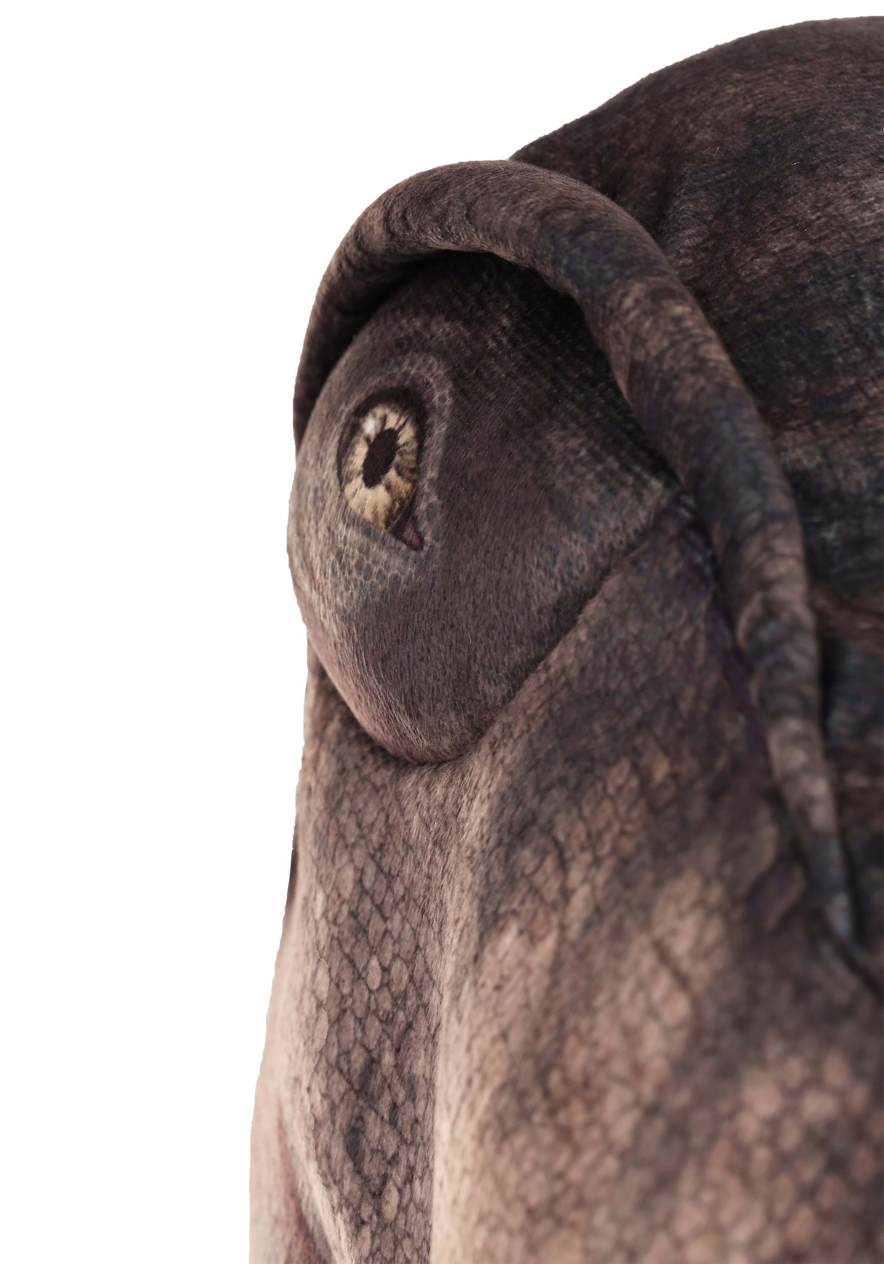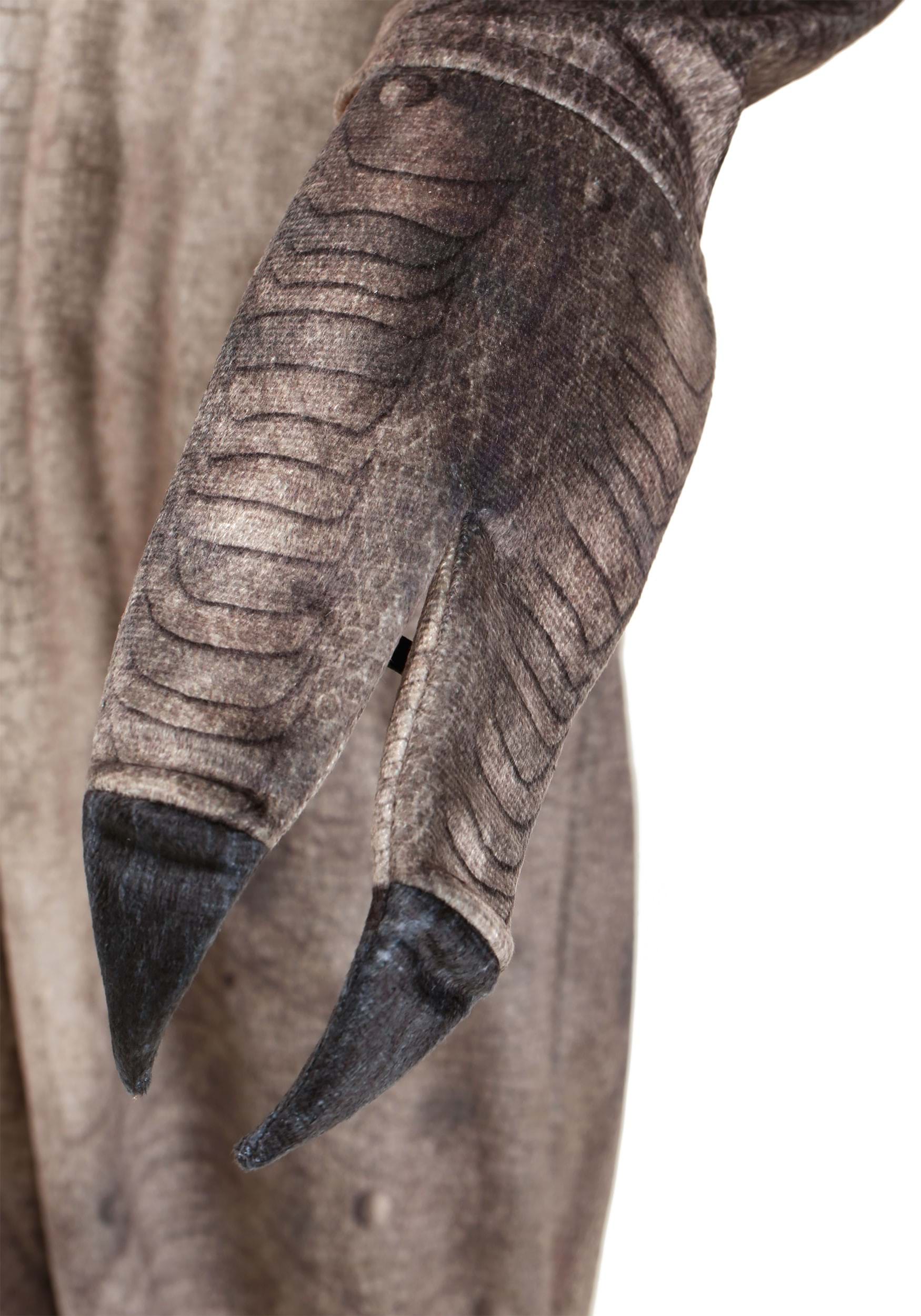 Transform into the greatest predator of all time when you wear this exclusive T-Rex Dinosaur Costume for Kids! The jumpsuit-style outfit zips up the front for easy dressing and is made of super-soft minky gray fabric that is much, much more comfortable than an actual T-Rex's hard reptilian scales. The stuffed foot covers end in faux claws and secure under your feet or street shoes with elastic bands. Matching clawed mitts are sewn to each sleeve cuff, and flip back to expose your human hands whenever you need to get a better grip on something - like that ice cream cone. The headpiece fastens at the back of your head and features eye and nose detail as well as fabric fangs.