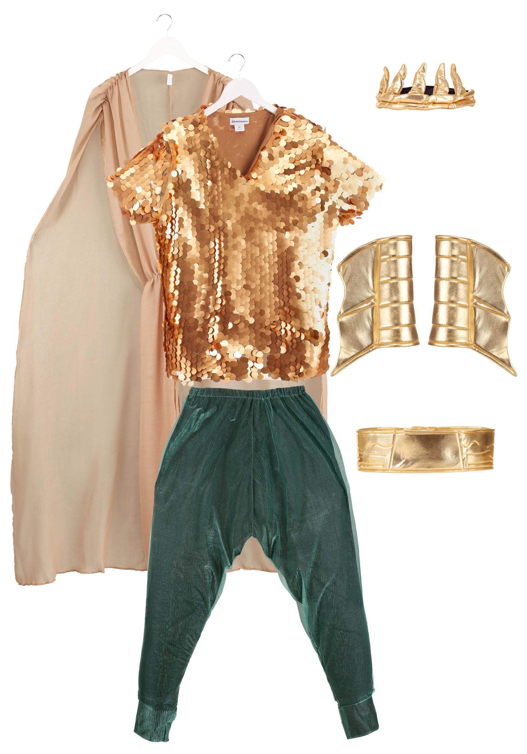 Now, before we start throwing divine implements out to anyone, we've got to make sure you look the part. Start off with this Poseidon Men's Costume and we'll see how you rank. This short-sleeved pullover tunic is fully lined for comfort. The shirt is covered in mesh with bronze sequins to give you that fresh-from-the-sea look. The elastic pants have a godly billowing effect thanks to the organza overlay while the long ivory cape assures the noble stature of an oceanic deity. Finish off the look with a golden belt and the golden coral crown and you might just find the waters ebbing to your decree!