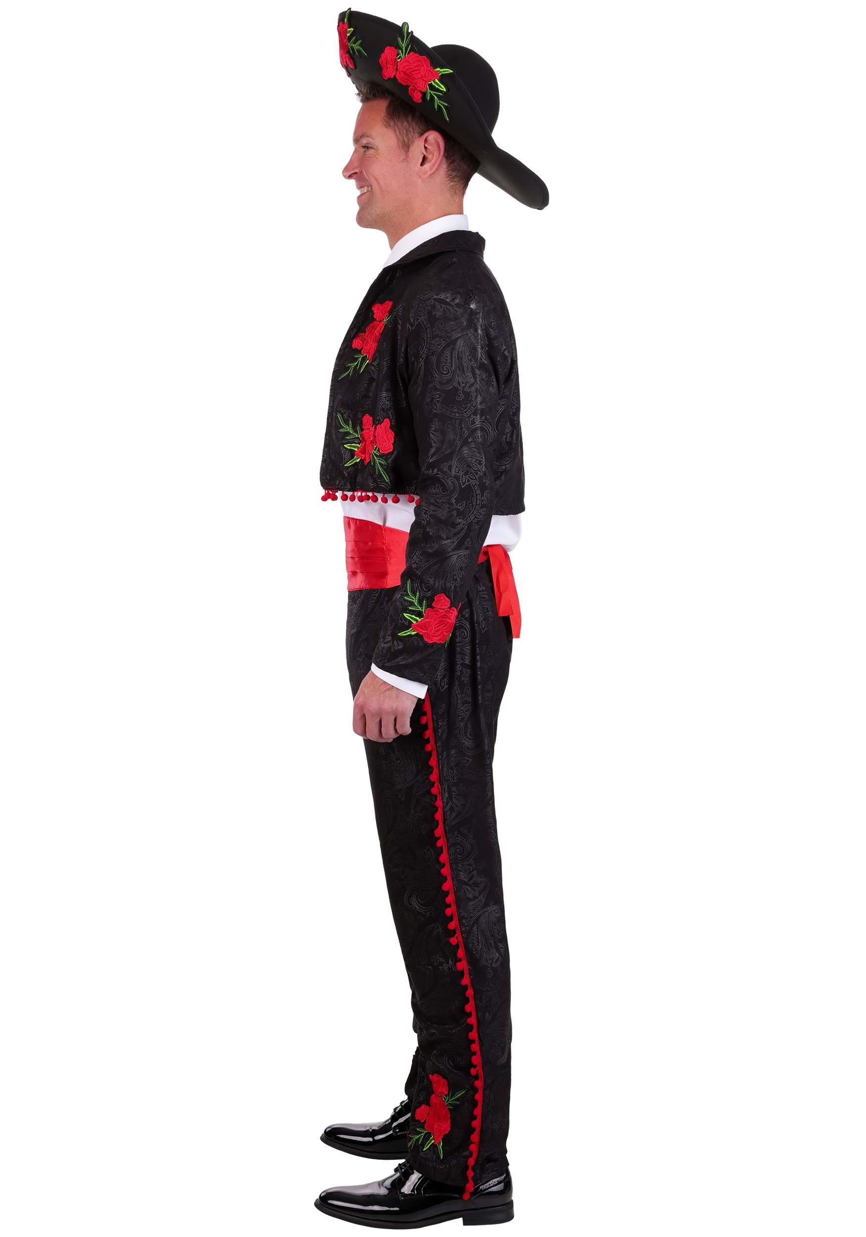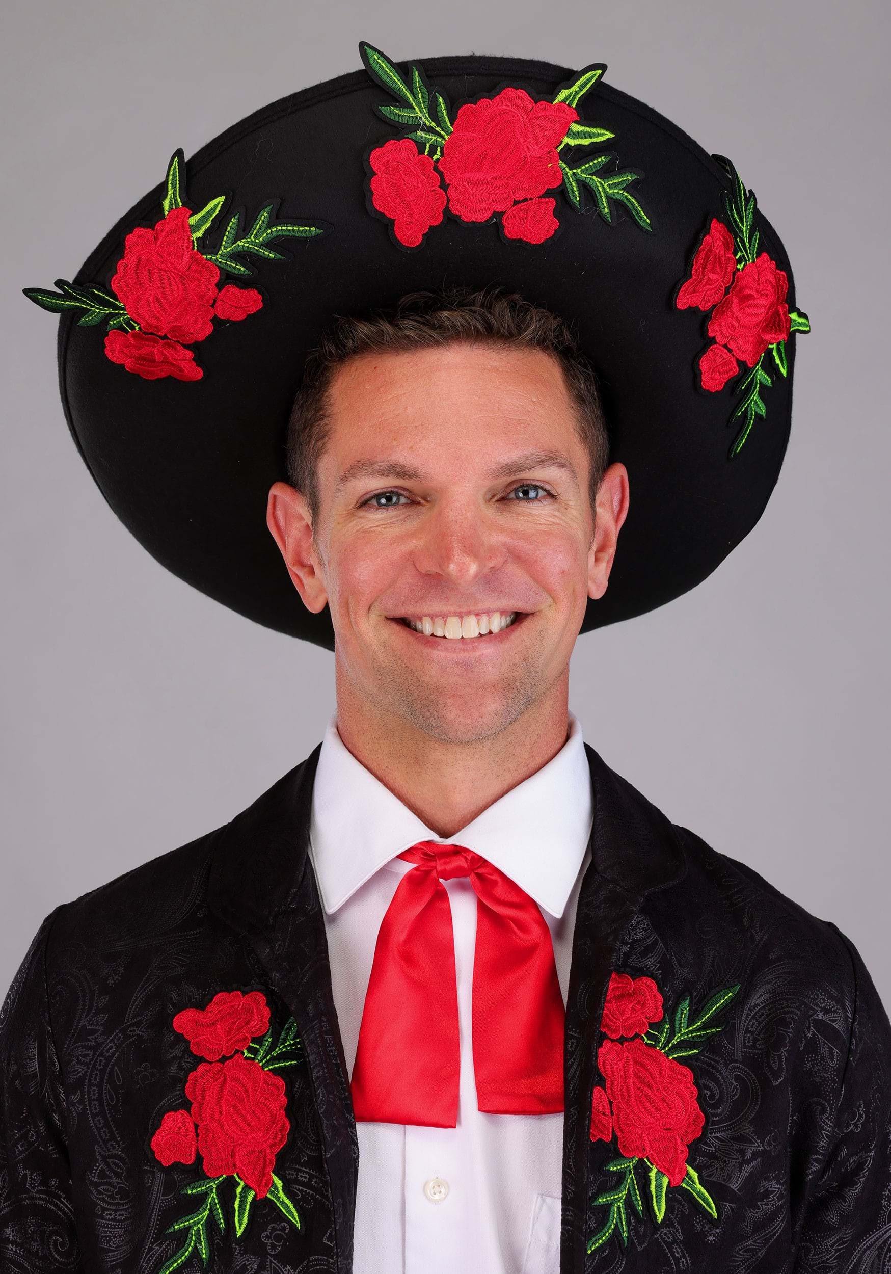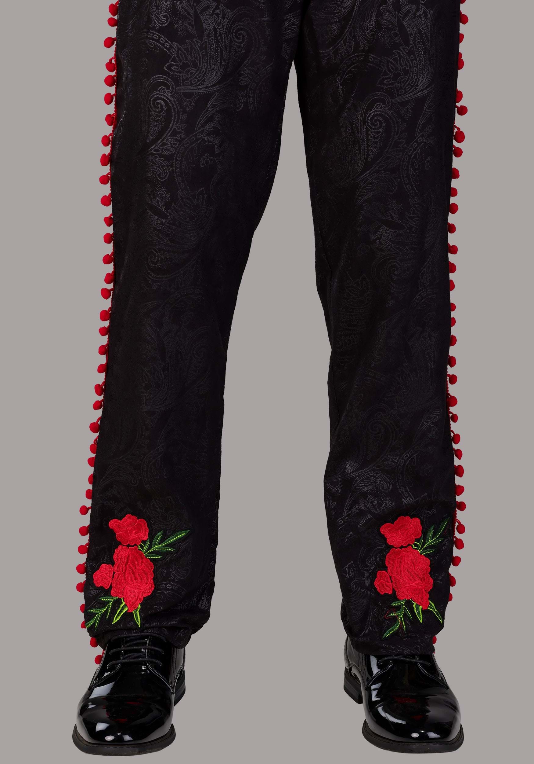 This exclusive costume is a colorful celebration of the Mexican mariachi tradition! The black suit has a subtle scrolling texture. Embellished with embroidered red roses on the jacket, pants, and the hat, it commands attention as soon as you walk into the room. Both the pants and the jacket are trimmed with red pom poms along the seams.