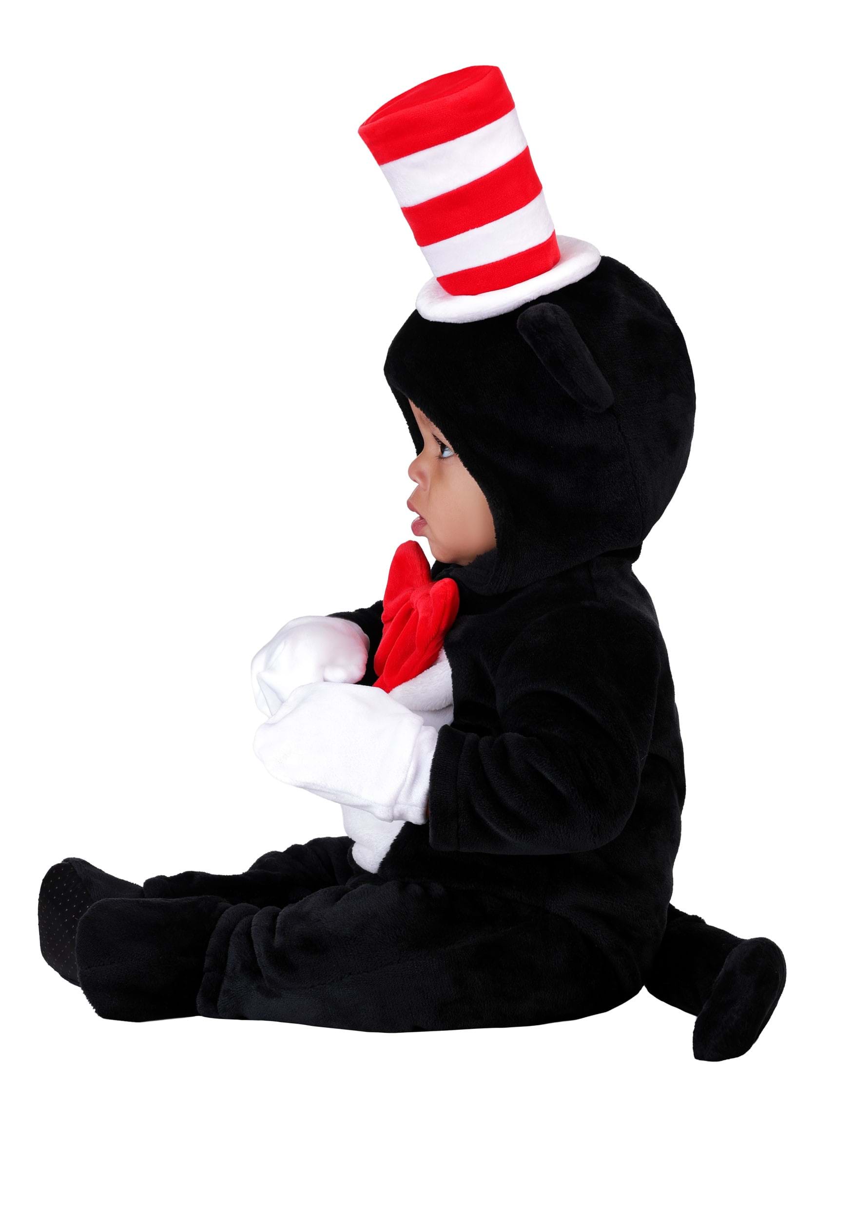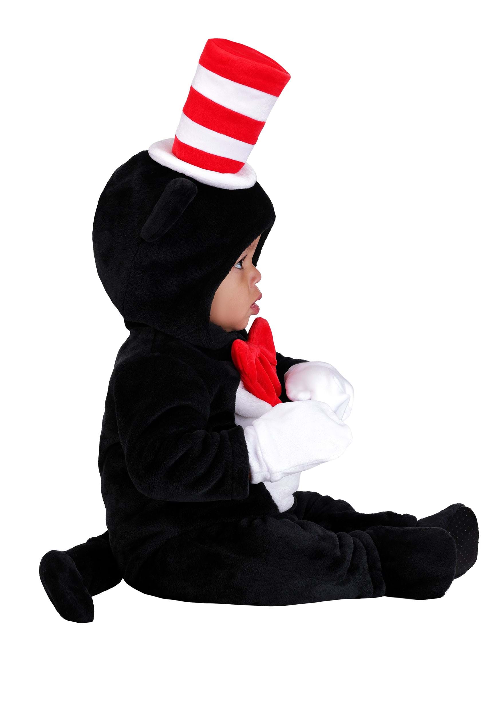 This Premium Infant Cat in the Hat Costume Onesie is basically the Cadillac of adorable chaos. It's made from shaggy luxe plush, which is just a fancy way of saying "your baby will feel like a living teddy bear." The jumpsuit features a polyfill-stuffed belly and a posable, wireframe tail that's perfect for swishing dramatically or knocking over pretend vases. The hood comes complete with cat ears and a tall, foam-backed, red-and-white striped hat, ensuring photogenic moments in a snap.