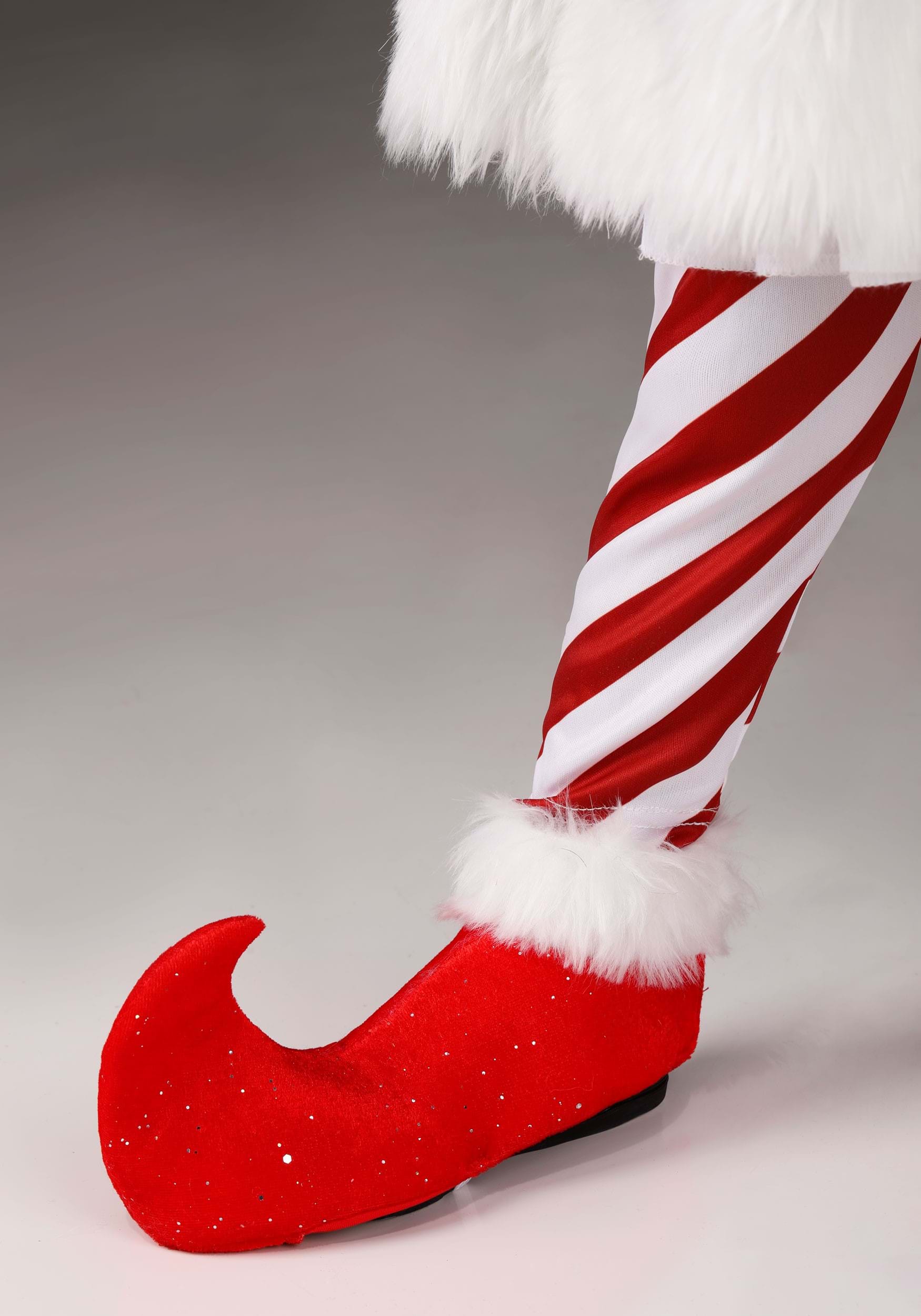 The dress itself is made of rich green velour with a zipper down the back for hassle-free dressing. The neckline, cuffs, and hem are trimmed in faux fur and finished with red ricrac for extra holiday flair. Three peppermint buttons adorn the bodice, and a layer of tulle beneath the skirt gives it a gentle bounce that’s ready for twirling—or toddling. The costume also includes red-and-white striped knit leggings with a soft elastic waistband for comfort and stretch. They add just the right dose of candy cane energy to an already sweet look.