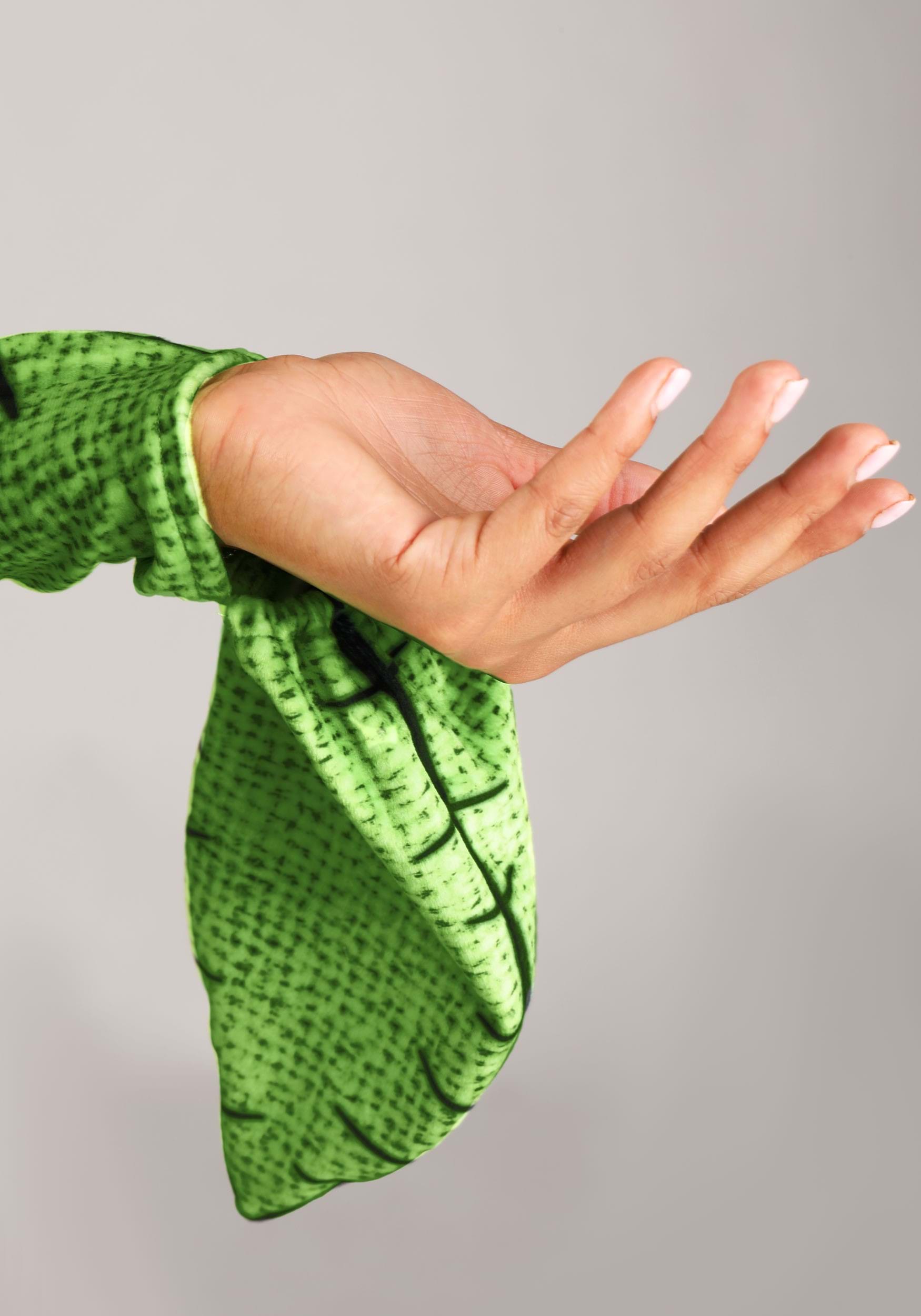 This cuddle plush dress recreates Oogie Boogie's look with a printed burlap-like texture, stitching, and illustrated bugs. The front zipper has a rubber snake pull tag for a distinctive flair while the hood features detailed fabric facial embroidery and an inner jersey lining adorned with buggy designs. With elastic wristbands and attached hand covers, along with a dangling felt spider on the hood, you'll be frightfully fabulous!