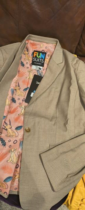 Get ready to have a little fun while you're working with this officially licensed Women's The Lion King Blazer from Disney! The exterior is made from a light beige textured linen fabric. The collar and lapels are made from the same fabric, but the inside has a fun surprise!