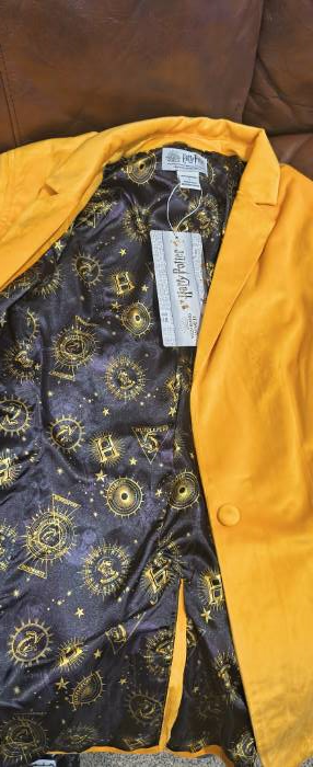 This exclusive, officially licensed Harry Potter Hufflepuff Blazer for Women looks as fabulous in your hometown as it would in the halls of Hogwarts! The statement jacket's exterior is made of golden yellow faux suede, and its inner shell is lined with black satin that's printed with stars, the Hufflepuff crest, and the Hogwarts crest. Besides its two functional flap pockets, the blazer also boasts decorative buttons on the sleeves and center front.