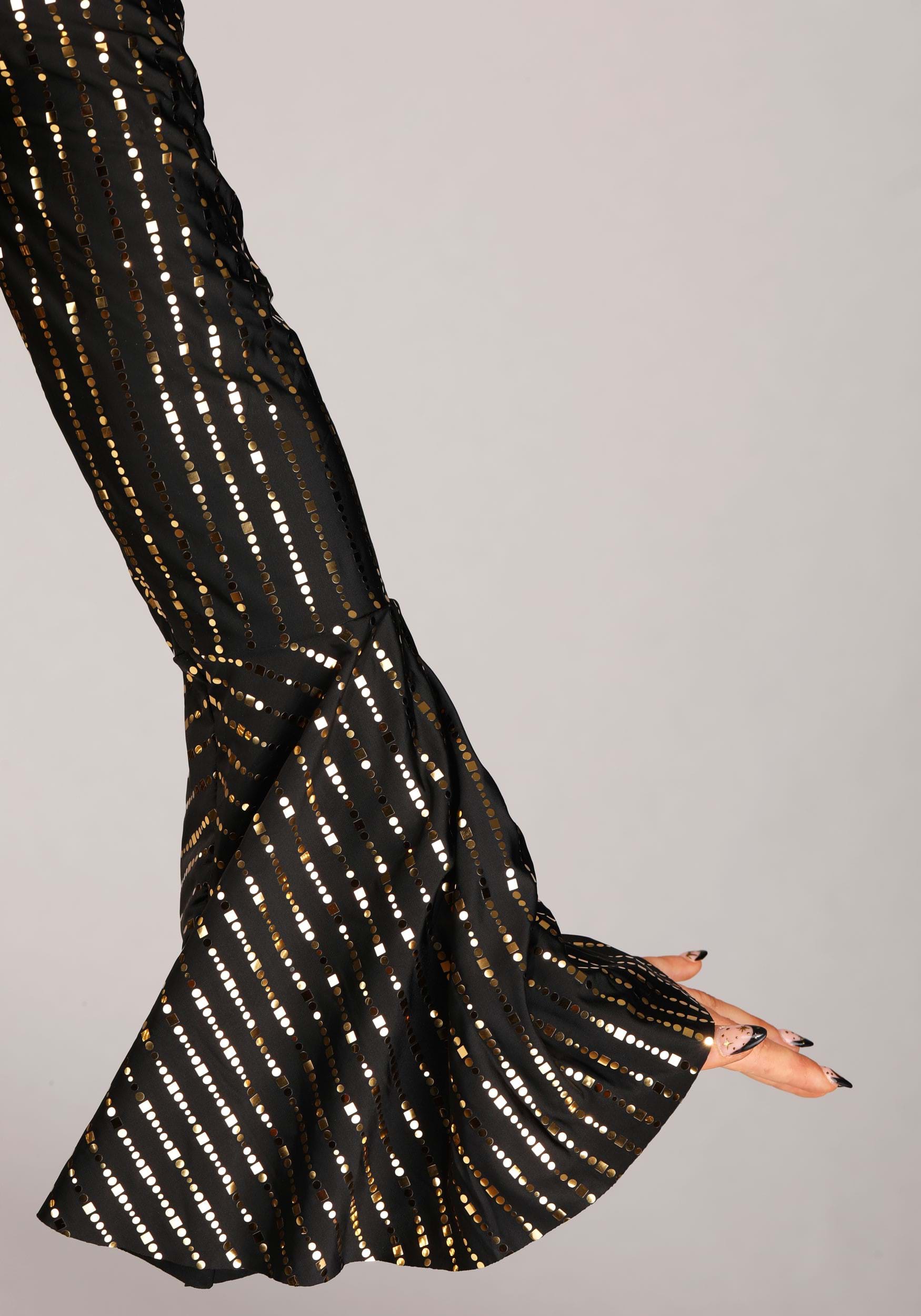This outfit includes a stretchy black dress adorned with eye-catching gold accents that shimmer with every move. The bell sleeves add a touch of '70s drama, perfect for striking poses and waving to your adoring fans. The wide belt with a metallic buckle pulls everything together for a flattering, retro-inspired look.